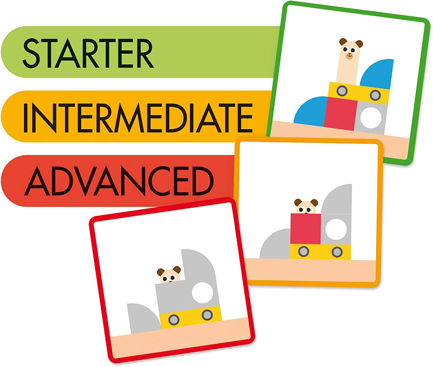 Ένα πρώτο εκπαιδευτικό παιχνίδι που βοηθά στην ανάπτυξη των παιδιών της αίσθησης του προσανατολισμού στο χώρο και τη λογική. Σε αυτό το έξυπνο παιχνίδι, τα μοντέλα που εμφανίζονται στις κάρτες πρέπει να κατασκευαστούν σωστά χρησιμοποιώντας τα ξύλινα κομμάτια. Το κουτί του παιχνιδιού χρησιμεύει ως βάση. Η μία πλευρά της κάρτας δείχνει την κατασκευή που θα γίνει αλλά δεν αποκαλύπτει όλα τα χρώματα. Η άλλη πλευρά της κάρτας έχει τη λύση, όλη έγχρωμη. Διαθέτει 3 επίπεδα προοδευτικής δυσκολίας για να συνοδεύουν ομαλά την ανάπτυξη και τη μάθηση του παιδιού Ένα πρακτικό παιχνίδι γιατί Το παιδί μπορεί να παίξει ανεξάρτητα. Αναπτύσσει τον συντονισμό χεριού-ματιού και χεριού, λεπτές κινητικές δεξιότητες και προάγει τη συγκέντρωση.