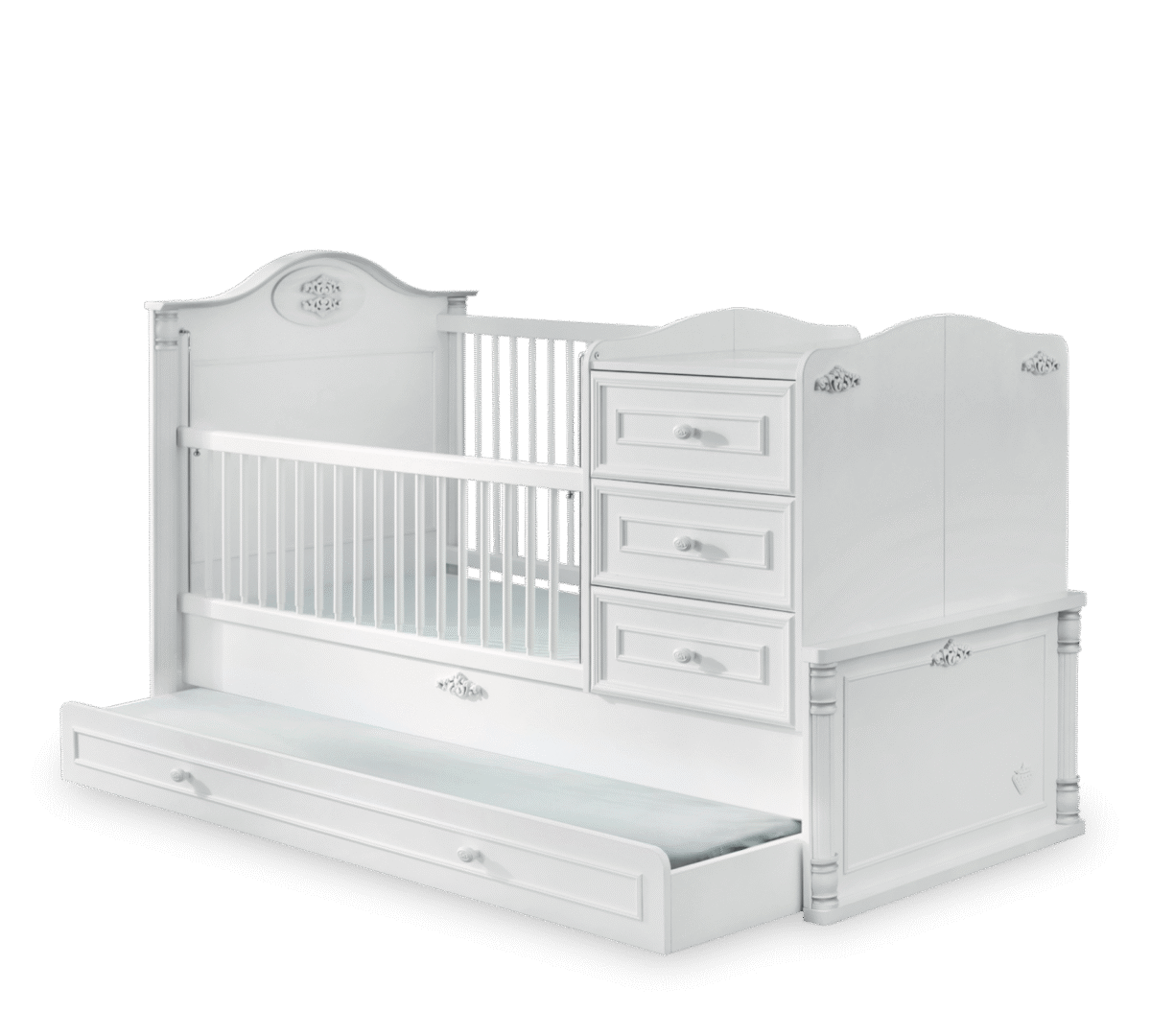 Χαρίστε στο μωρό σας έναν χώρο βγαλμένο από…παραμύθι και διαμορφώστε τον ιδανικό χώρο για την πριγκίπισσά σας που θα την συντροφεύει για πολλά χρόνια!! Η βρεφική πολυμορφική κούνια της σειράς ROMANTIC ξεχωρίζει για την κομψότητα, τη λειτουργικότητα, την ασφάλεια και την άνεση. Διαθέτει τρία αποθηκευτικά συρτάρια και ένα μεγάλο συρτάρι στο κάτω μέρος του κρεβατιού, για να αποθηκεύσετε όλα όσα χρειάζεται το μωρό σας. Η βρεφική κούνια έχει ρυθμιζόμενο κάγκελο για εύκολη και γρήγορη πρόσβαση στο μωρό και καθώς μεγαλώνει το παιδί, μετατρέπεται σʼ ένα εντυπωσιακό κρεβάτι και μία συρταριέρα.
