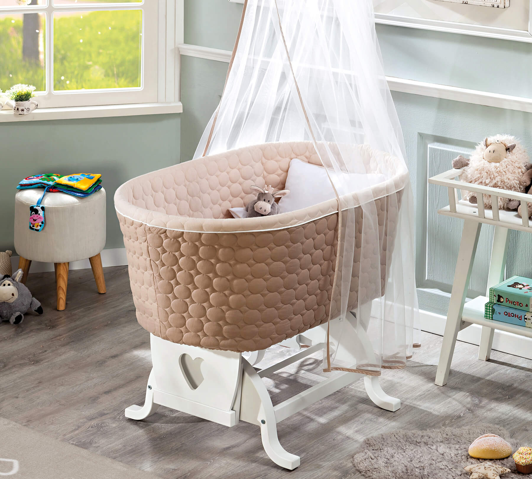 - Περιλαμβάνονται το στρώμα και η προίκα μωρού (πλαϊνή προστασία, πάπλωμα, κουνουπιέρα, διακοσμητικό μαξιλάρι)