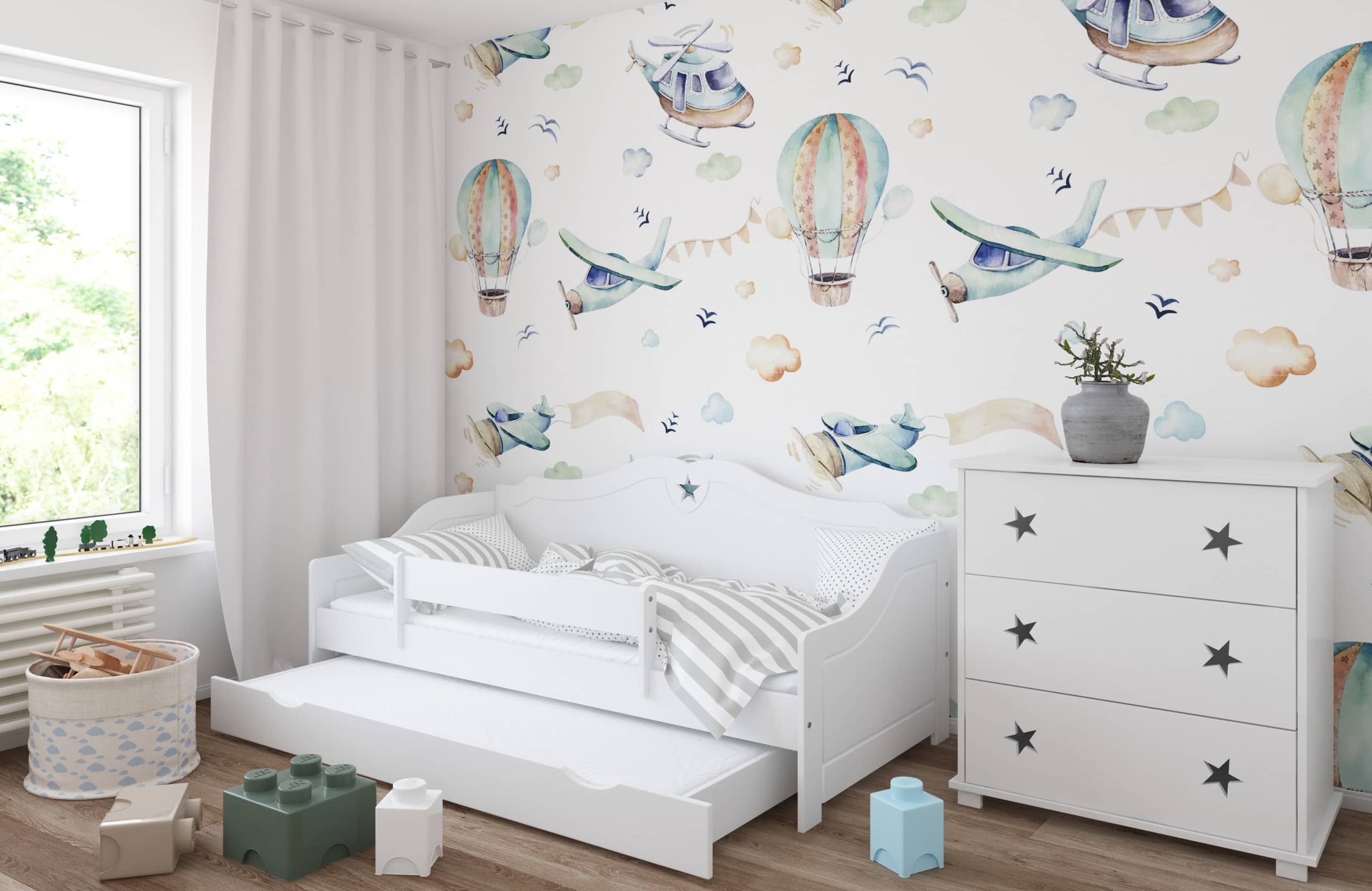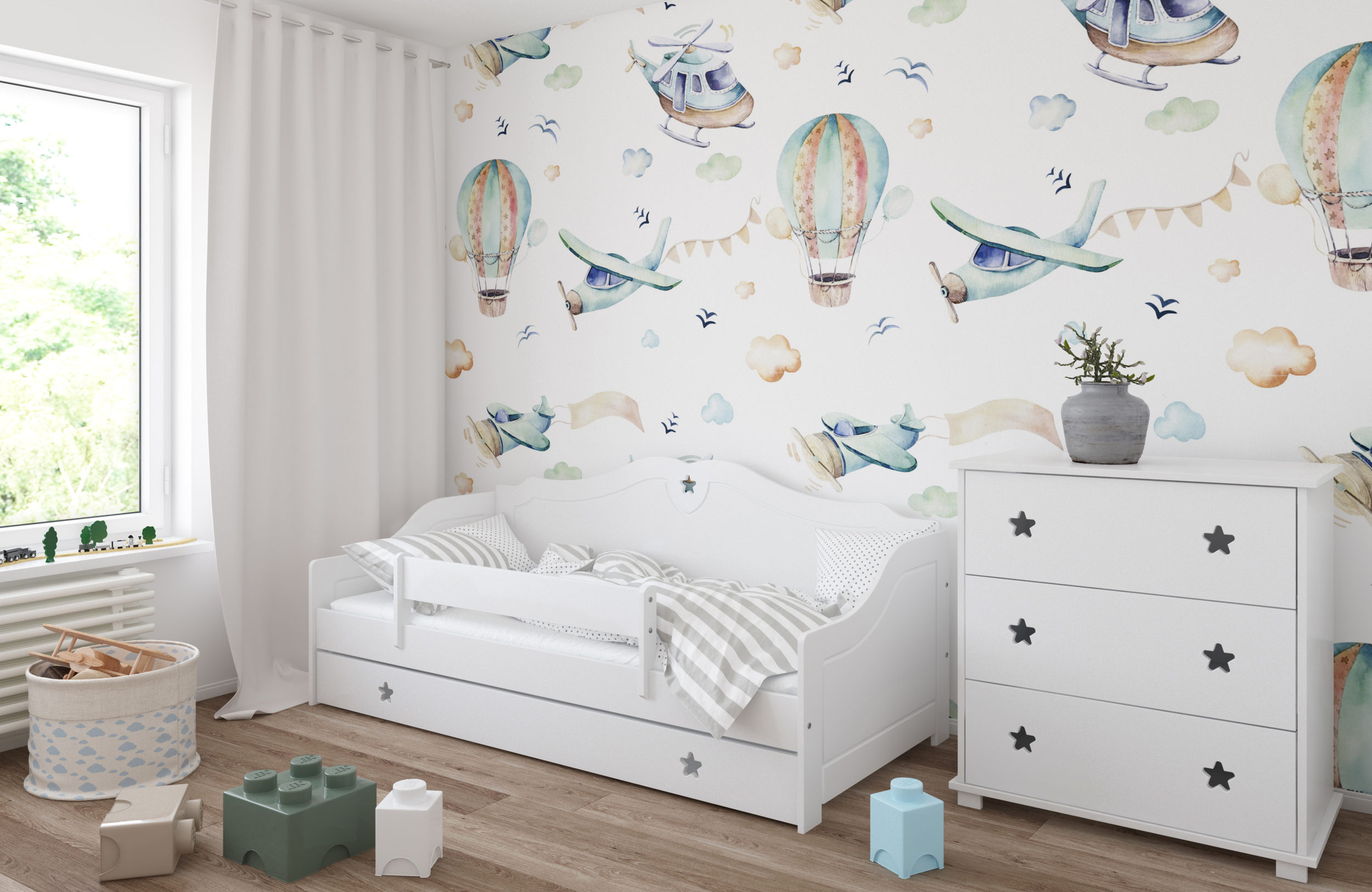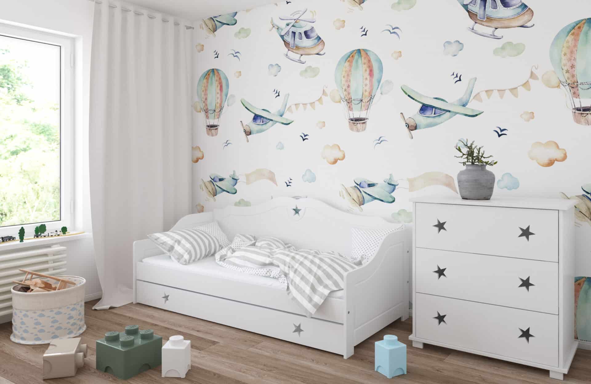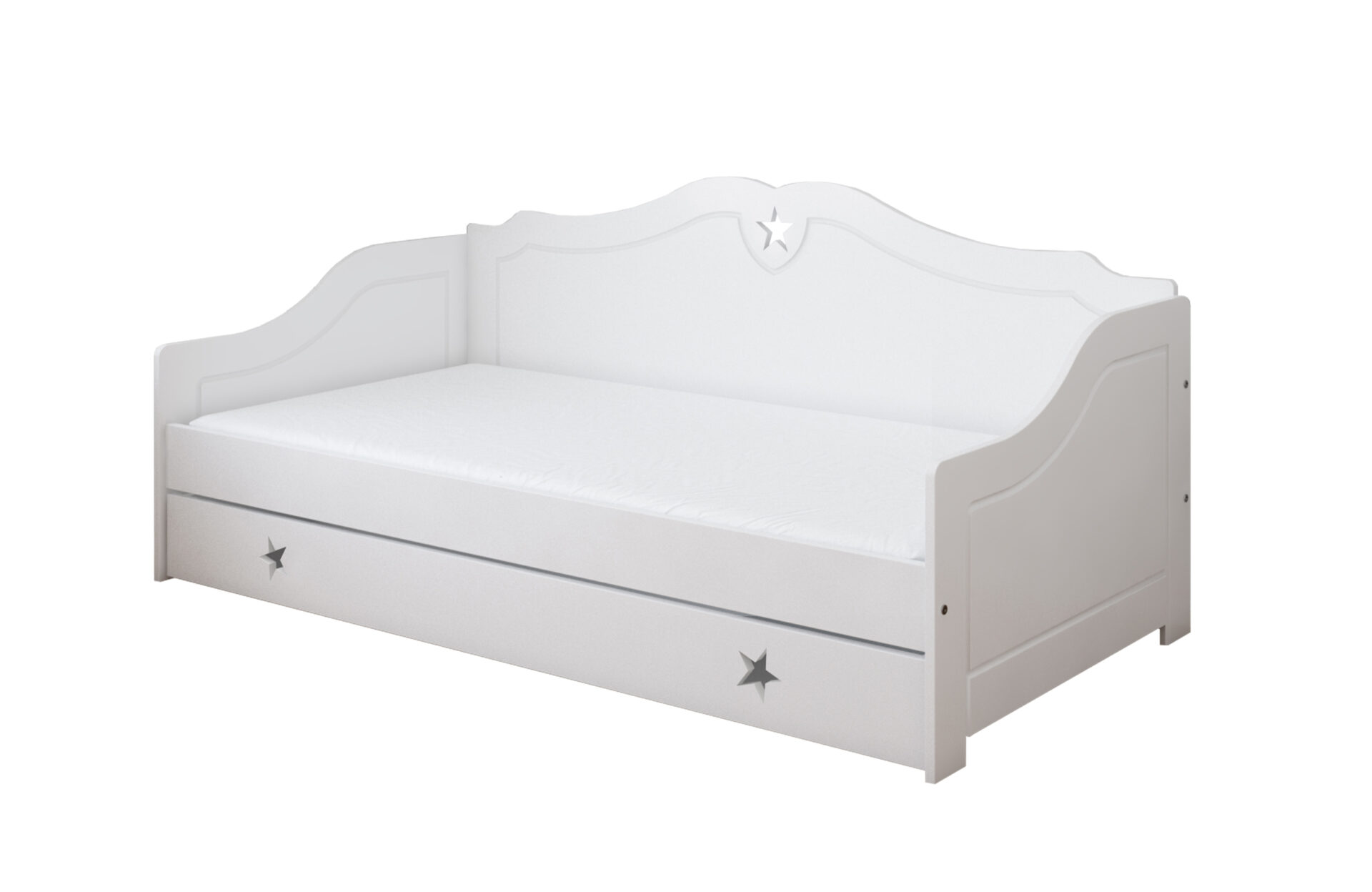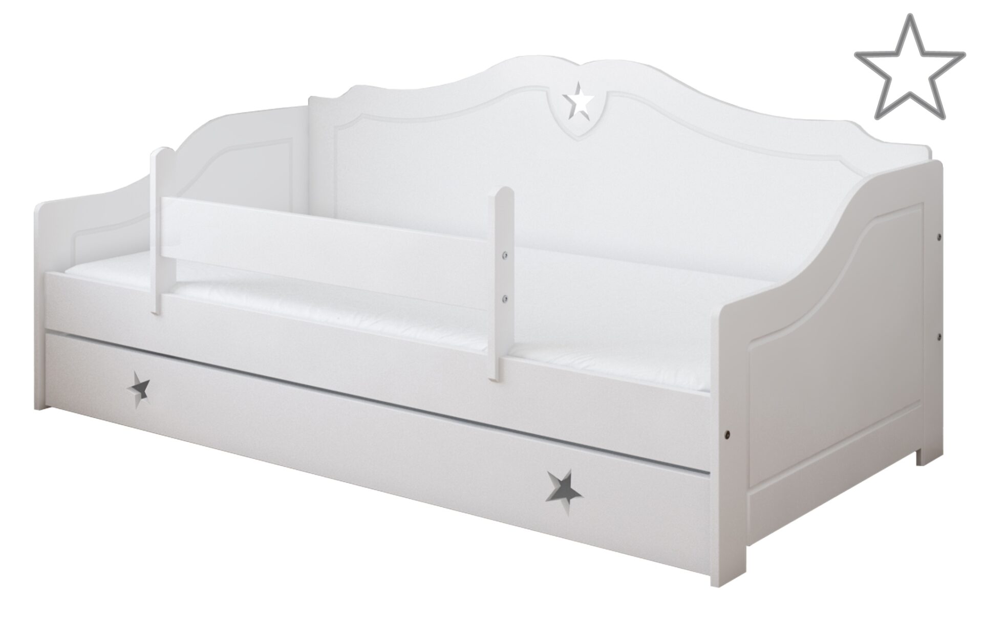 Το μοντέρνο συναντάει το κλασικό. Ο καναπές κρεβάτι Franio έχει πλάτη και πλαϊνά με καμπυλωτό σχήμα που δημιουργούν ένα κύμα και δίνουν την αίσθηση ενός κλασικού επίπλου. Διαθέτει αποθηκευτικό συρτάρι στο κάτω μέρος, ώστε να φυλάξετε όλα τα προσωπικά σας αντικείμενα! Ο ιδιαίτερος σχεδιασμός του με το χαρακτηριστικό αστέρι να διακοσμεί την πλάτη του, το κάνει μοναδικό και ξεχωριστό! Είναι κατάλληλο για παιδιά από 3 ετών και επιπλέον για το πρώτο διάστημα συμπεριλαμβάνεται προστατευτικό πλαϊνό κάγκελο το οποίο στη συνέχεια αφαιρείται.
