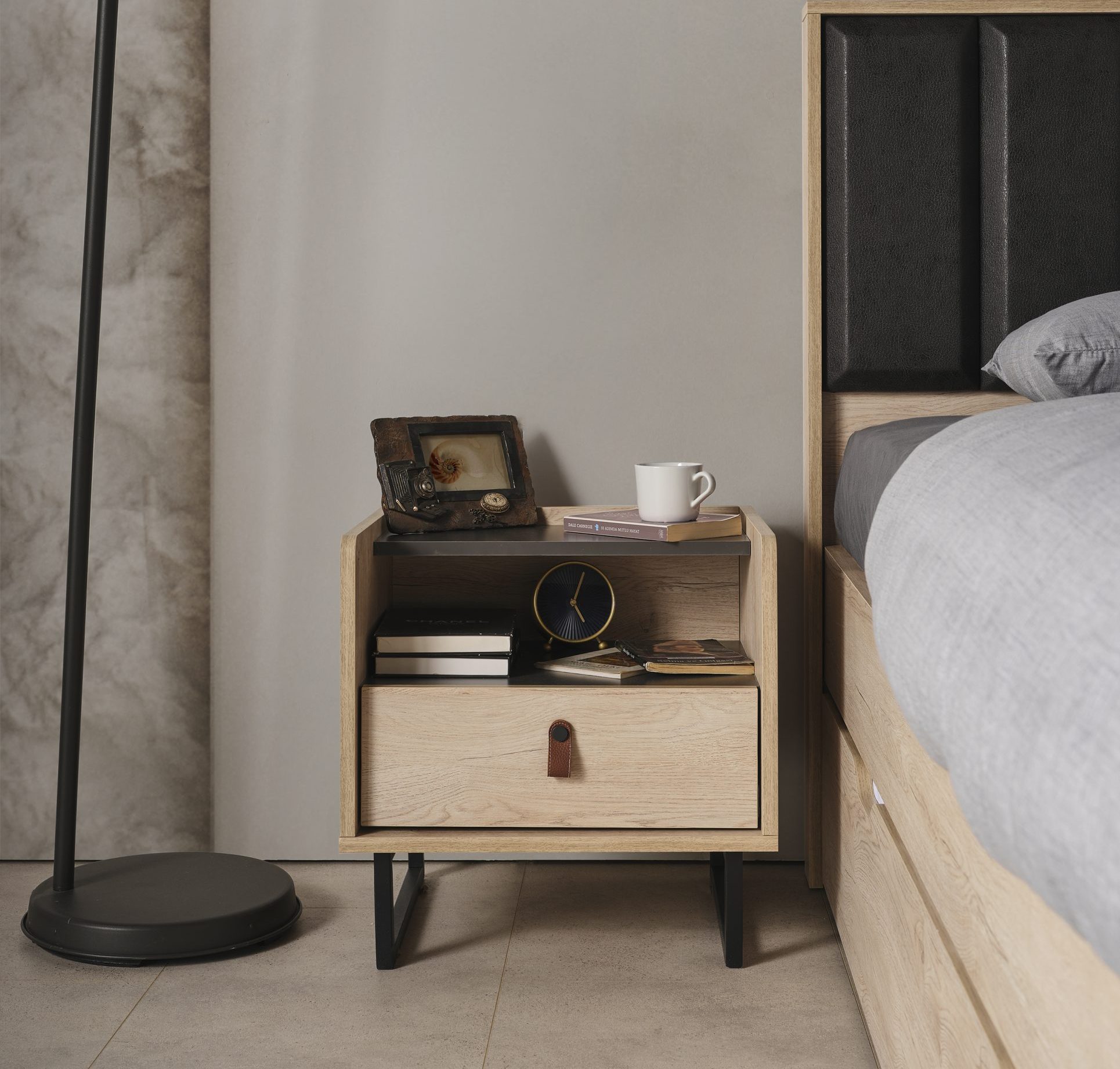 Το κομοδίνο θα συμπληρώσει θαυμάσια το κρεβάτι Neon Teen και θα εντυπωσιάσει αγόρια και κορίτσια όλων των ηλικιών. Διαθέτει ένα συρτάρι για την αποθήκευση των προσωπικών αντικειμένων. Σχεδιαστικά ακολουθεί και αυτό την ίδια μοντέρνα γραμμή παίζοντας με τα χρώματα του μαύρου και του φυσικού ξύλου.