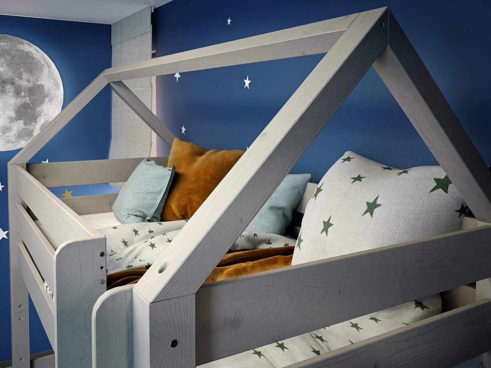 Παράλληλα, η κουκέτα προσφέρει άνετο χώρο ύπνου για τρία παιδιά, γεγονός που την καθιστά ιδανική επιλογή για οικογένειες με περισσότερα παιδιά ή για δωμάτια φιλοξενίας. Η ιδιαίτερη αισθητική της μετατρέπει το κρεβάτι σε ένα όμορφο σημείο του δωματίου που συνδυάζει παιχνίδι και ξεκούραση.