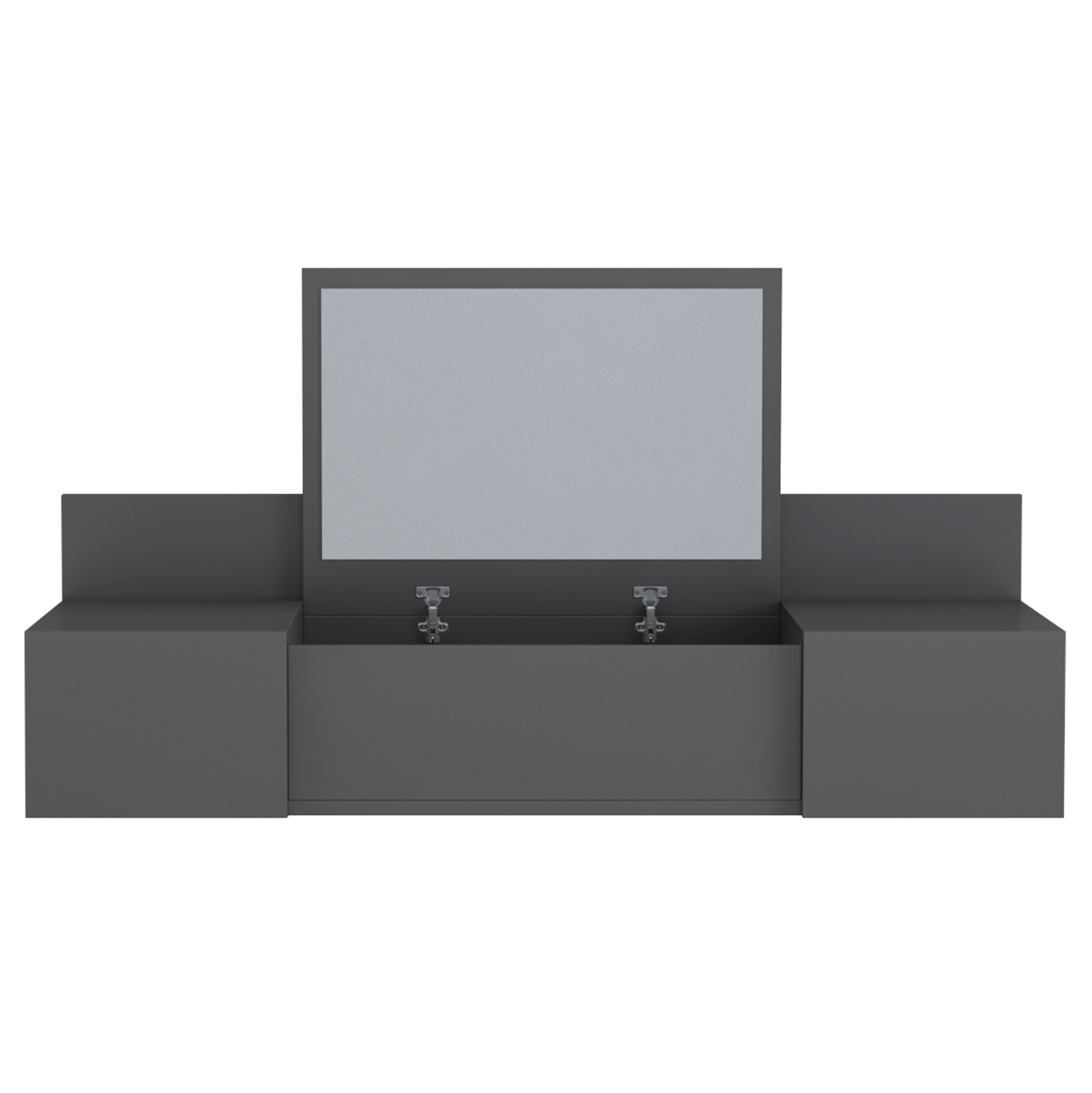 Η κρεμαστή τουαλέτα τοίχου με καθρέπτη τοποθετείται απευθείας στον τοίχο, εξοικονομώντας χώρο και δημιουργώντας ένα καθαρό και οργανωμένο περιβάλλον. Διαθέτει πτυσσόμενο καθρέπτη, ο οποίος όταν κλείνει μετατρέπει το έπιπλο σε έναν πρακτικό πάγκο. Έτσι μπορεί να χρησιμοποιηθεί τόσο ως έπιπλο μακιγιάζ όσο και ως διακοσμητική επιφάνεια.