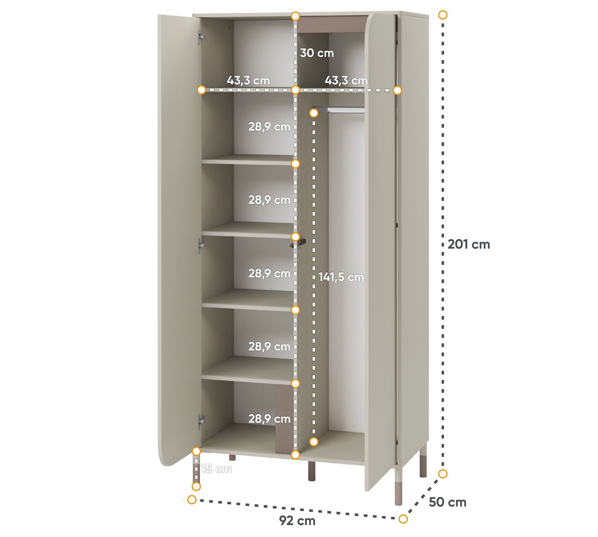 • Εξωτερική Διάσταση Ντουλάπας: Πλάτος 92cm x Βάθος 50cm x Ύψος 201cm