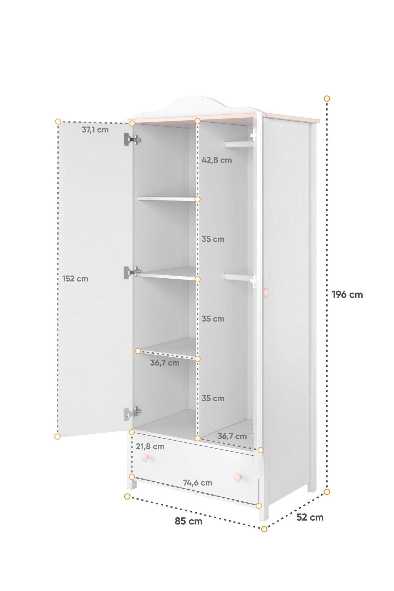 • Εξωτερική Διάσταση Ντουλάπας: Πλάτος 85cm x Βάθος 52cm x Ύψος 196cm
