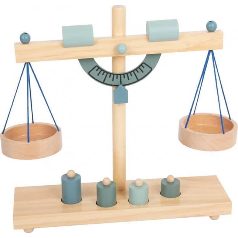 Με αυτή τη σταθερή ξύλινη ζυγαριά- παλαιού τύπου, οι μικροί έμποροι έχουν τα σωστά εργαλεία όταν ζυγίζουν το φαγητό για τους πελάτες τους στο παντοπωλείο ή στη παιδικής αγορά. Τέσσερα διαφορετικά βάρη βοηθούν στον προσδιορισμό του συνολικού βάρους και δύο συρόμενα αντίβαρα χρησιμοποιούνται για τη ρύθμιση της ισορροπίας. Τα παιδιά εξασκούνται στην αίσθηση του βάρους και της ισορροπίας με παιχνιδιάρικο τρόπο.