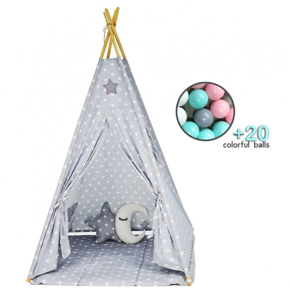 Η παιδική σκηνή περιλαμβάνει το στρωματάκι – χαλάκι για να παίζει άνετα το παιδί σας όταν κάθεται στη σκηνή του, 20 μπάλες σε απαλές αποχρώσεις καθώς και διακοσμητικές σημαίες.