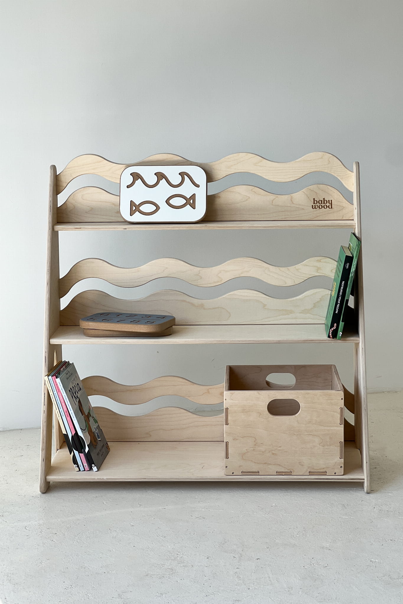 Λευκή ραφιέρα Montessori Wave Medium BabyWood, παιδικό ράφι για βιβλία.