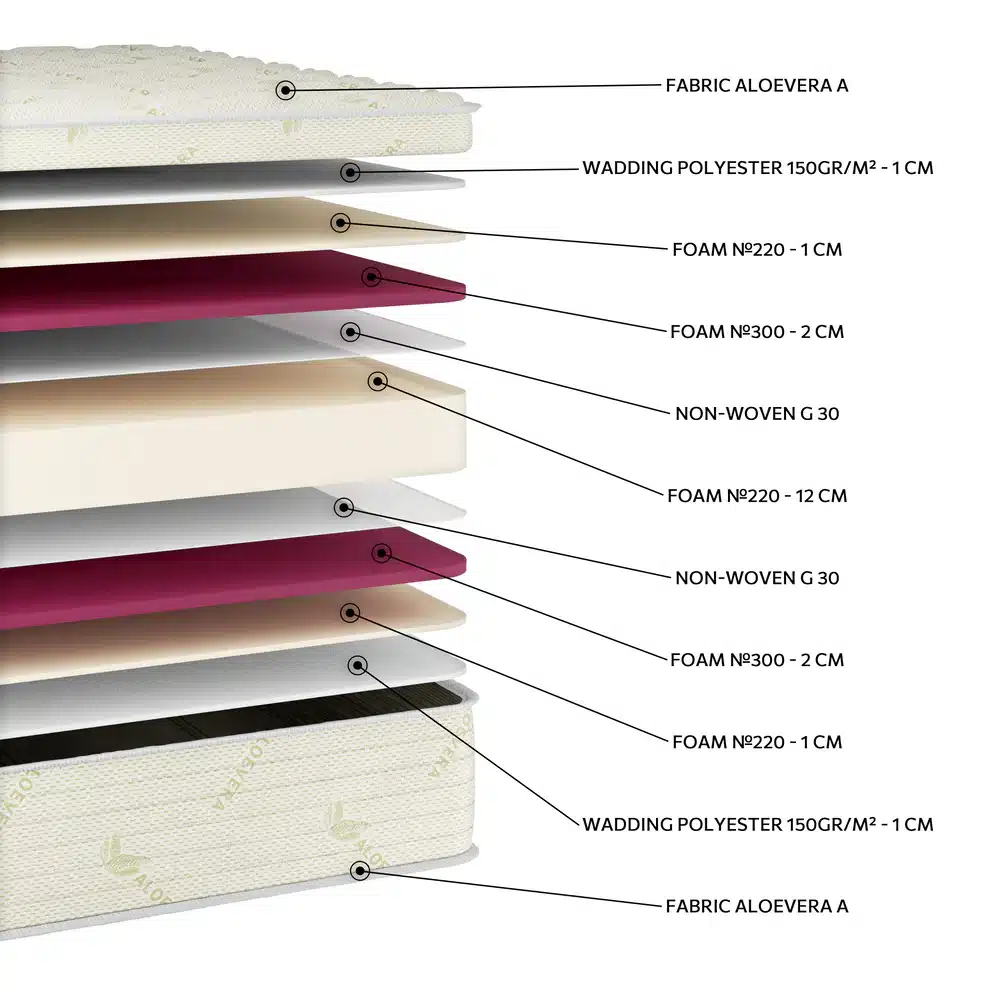 Στρώμα αφρού με μέτρια σκληρότητα, που προσφέρει ισορροπία ανάμεσα στην άνεση και τη στήριξη. Οι στρώσεις αφρού προσαρμόζονται στο σώμα, ανακουφίζοντας από την πίεση και διατηρώντας την ευθυγράμμιση της σπονδυλικής στήλης. Το ύφασμα Aloe Vera A προσφέρει φυσική αίσθηση φρεσκάδας και συμβάλλει στον σωστό αερισμό του στρώματος.