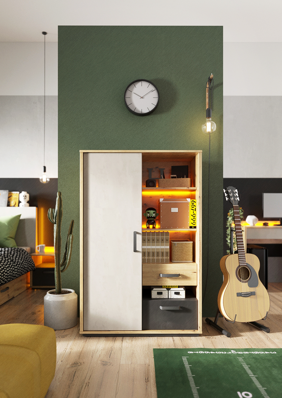 Βιβλιοθήκη Qubic μεσαίου ύψους με ξεχωριστό χώρο αποθήκευσης και προβολής. Πίσω από τις πόρτες των ντουλαπιών θα βρείτε τέσσερα βολικά ράφια για ρούχα και σχολικά είδη. Δύο εύκολα προσβάσιμα συρτάρια διευκολύνουν την αποθήκευση διαφόρων μικρών αντικειμένων. Τα ανοιχτά ράφια/εσοχές είναι ένα καλό μέρος για βιβλία, βοηθήματα διδασκαλίας και άλλα μικροαντικείμενα.