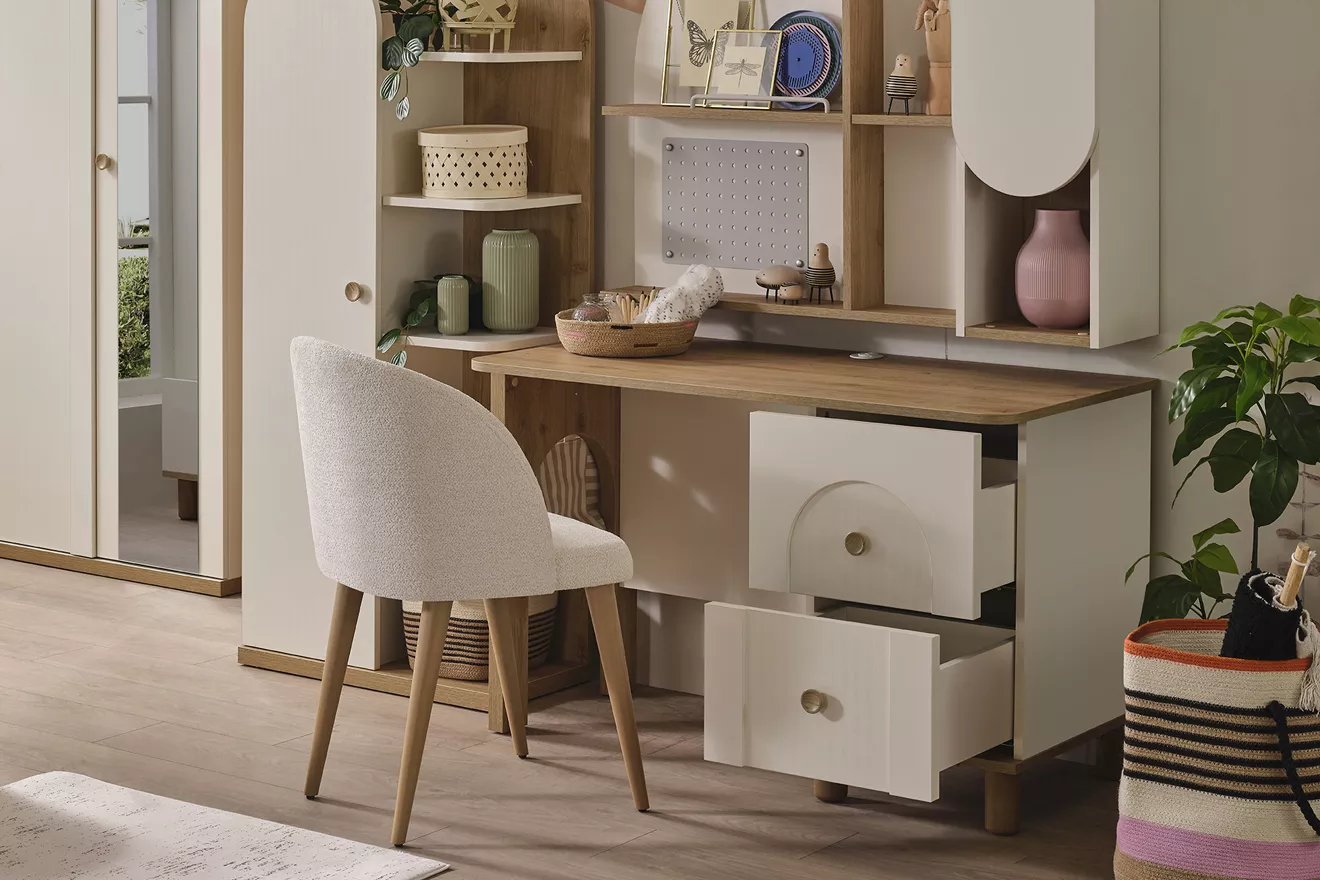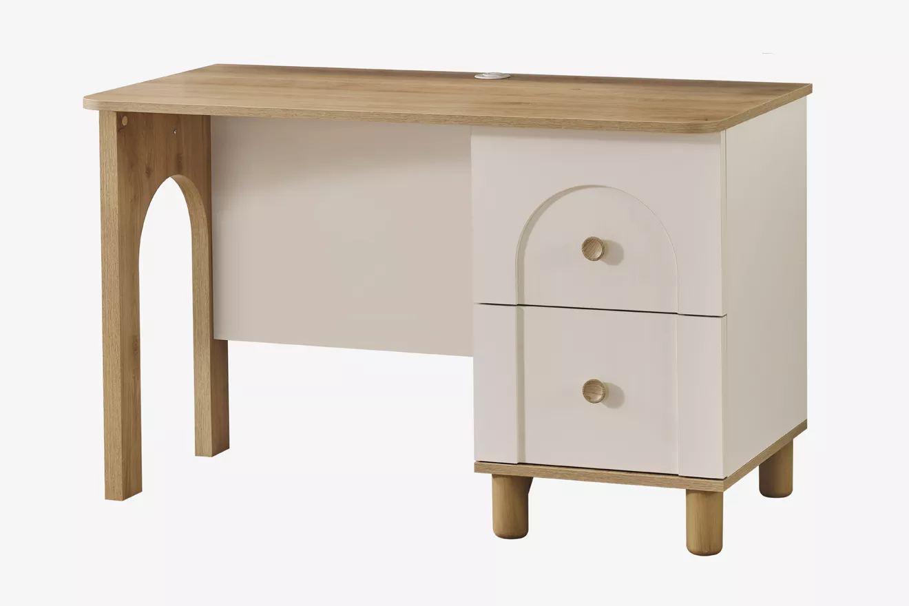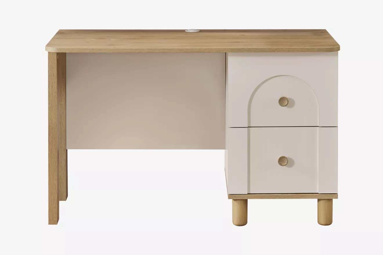 Ένα γραφείο για τα παιδιά που θέλουν να συνδυάσουν μοντέρνο και διαχρονικό χαρακτήρα στον χώρο τους. Διαθέτει μια άνετη επιφάνεια εργασίας σε φυσική ξύλινη απόχρωση και δύο συρτάρια για την αποθήκευση όλης της γραφικής ύλης. Διαθέτει θύρα USB που σάς επιτρέπει να φορτίζετε ηλεκτρονικές συσκευές όπως smartphone ή tablet. Στην αριστερή πλευρά του γραφείου υπάρχει ένας γάντζος στον οποίο μπορείτε να κρεμάσετε μια σχολική τσάντα ή ακουστικά.