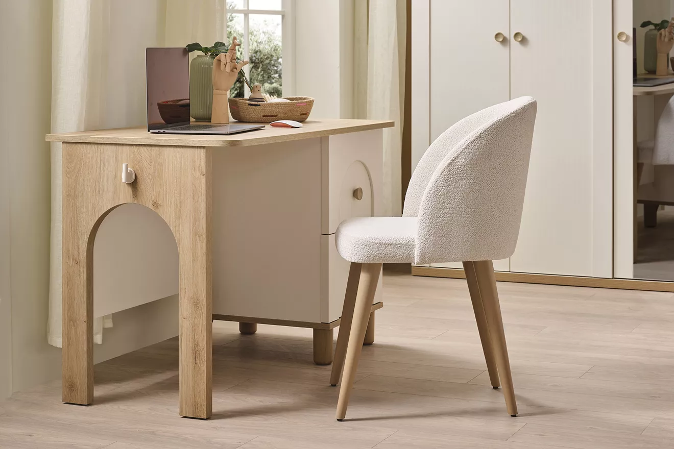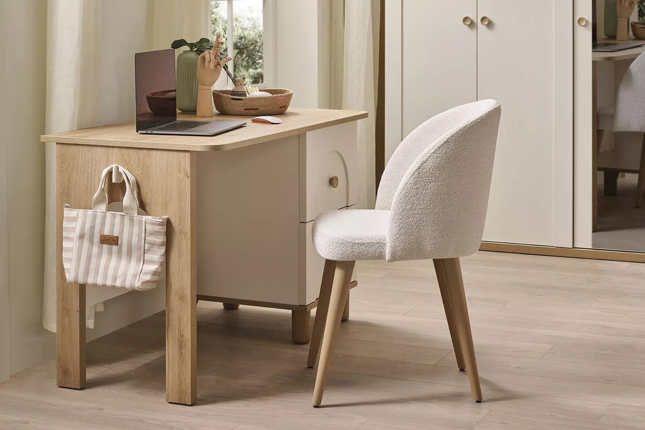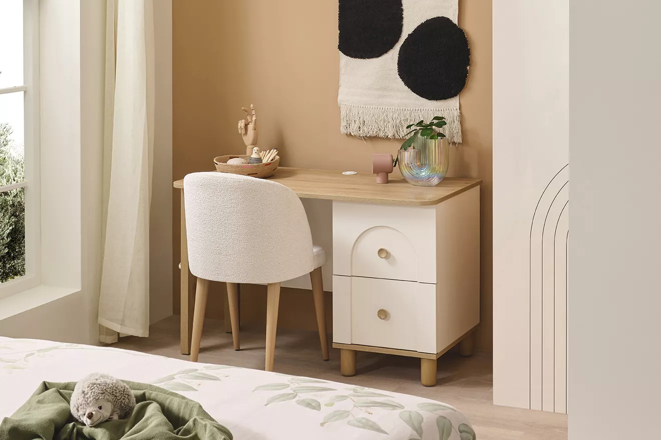 Ένα γραφείο για τα παιδιά που θέλουν να συνδυάσουν μοντέρνο και διαχρονικό χαρακτήρα στον χώρο τους. Διαθέτει μια άνετη επιφάνεια εργασίας σε φυσική ξύλινη απόχρωση και δύο συρτάρια για την αποθήκευση όλης της γραφικής ύλης. Διαθέτει θύρα USB που σάς επιτρέπει να φορτίζετε ηλεκτρονικές συσκευές όπως smartphone ή tablet. Στην αριστερή πλευρά του γραφείου υπάρχει ένας γάντζος στον οποίο μπορείτε να κρεμάσετε μια σχολική τσάντα ή ακουστικά.