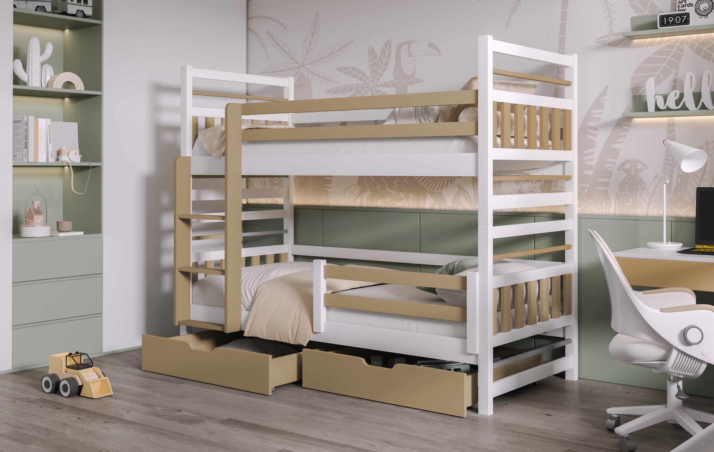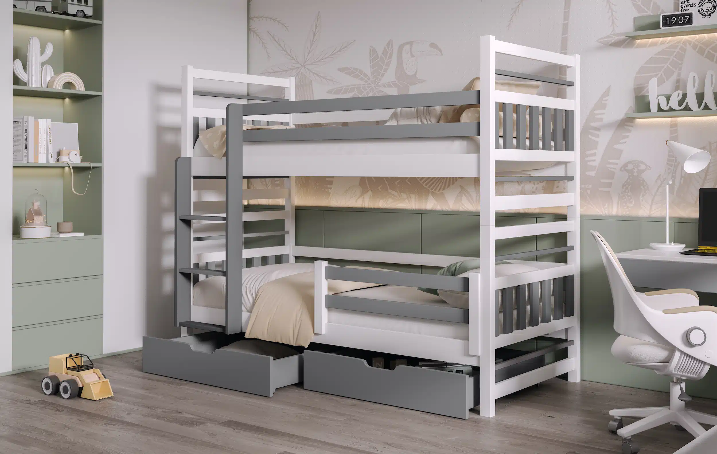 Η παιδική κουκέτα Miromir προσφέρει μία έξυπνη και λειτουργική λύση για το παιδικό δωμάτιο, καθώς ενσωματώνει δύο πρακτικά συρτάρια που διευκολύνουν την καθημερινή οργάνωση. Παράλληλα, αξιοποιεί στο έπακρο τον διαθέσιμο χώρο, χωρίς να θυσιάζει την άνεση.