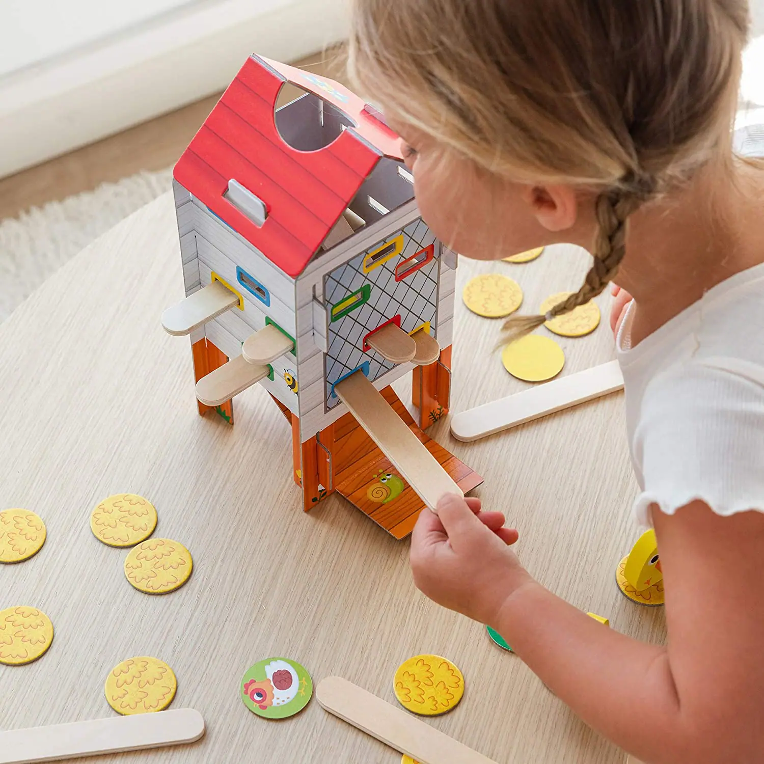 Πρόκειται για ένα επιτραπέζιο παιχνίδι ταχύτητας. Τα κοτοπουλάκια παίζουνε κρυφτό στον αχυρώνα. Μετακινήστε τα ξυλάκια για να τα βρείτε. Ποιος θα καταφέρει να μαζέψει τα περισσότερα κοτοπουλάκια;