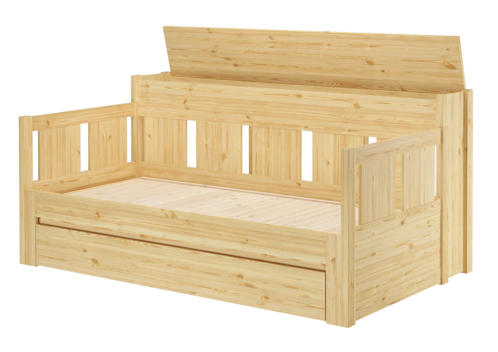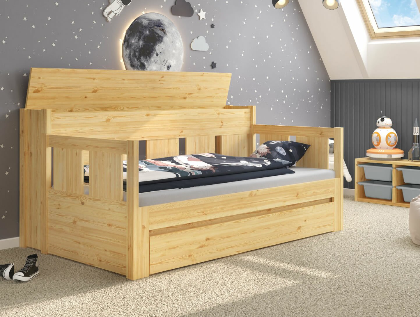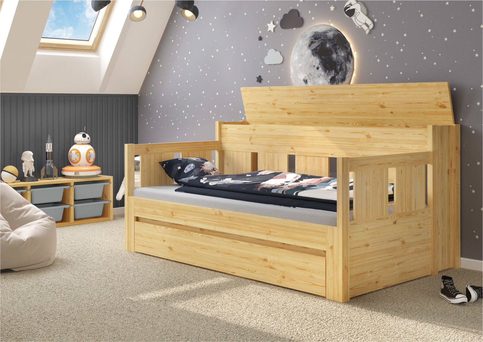 Επίσης διαθέτει ένα αποθηκευτικό κουτί στο πίσω μέρος του κρεβατιού, ώστε να αποθηκεύετε εύκολα το στρώμα του συρόμενου κρεβατιού και να το χρησιμοποιείτε, όποτε το χρειάζεστε.