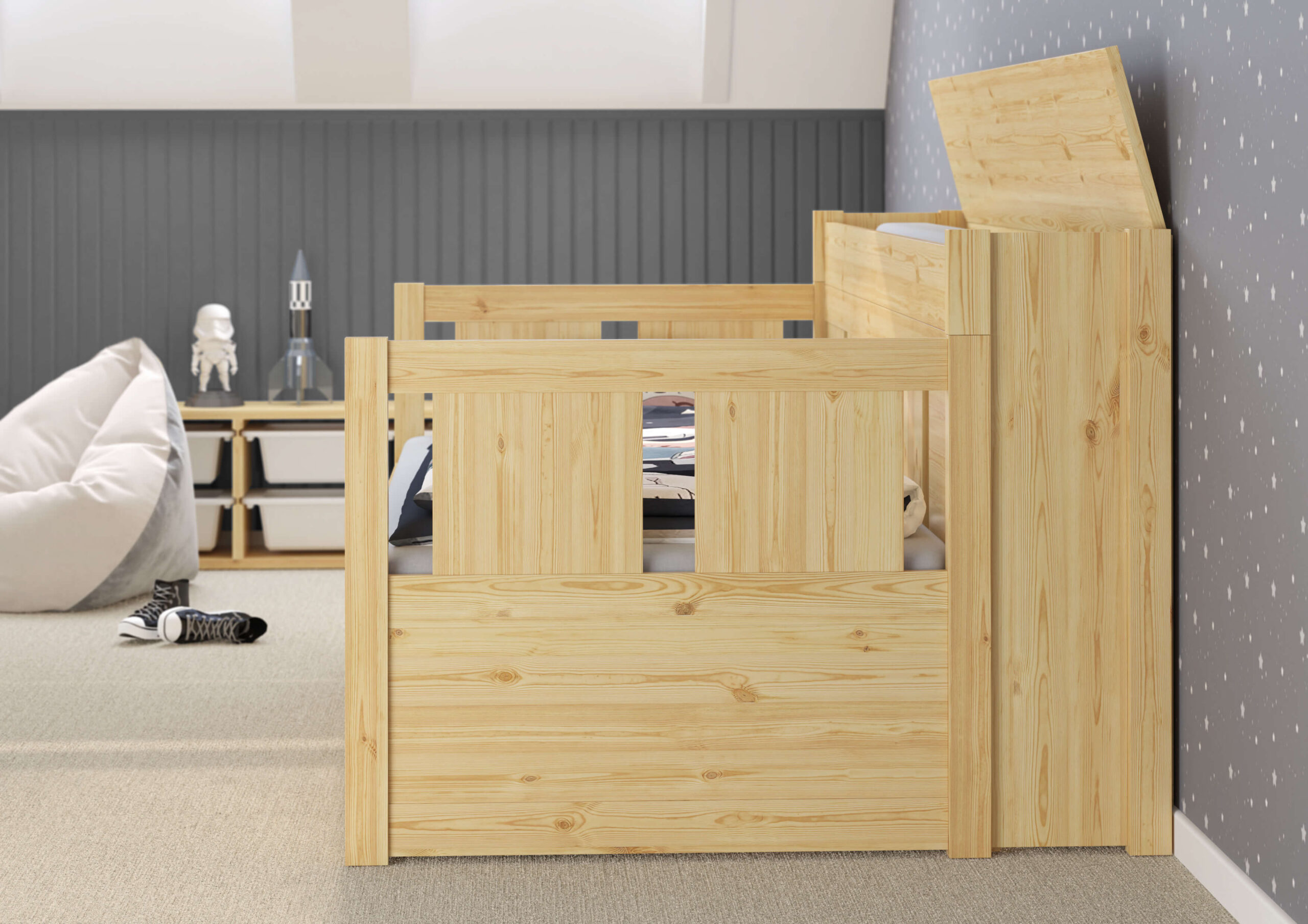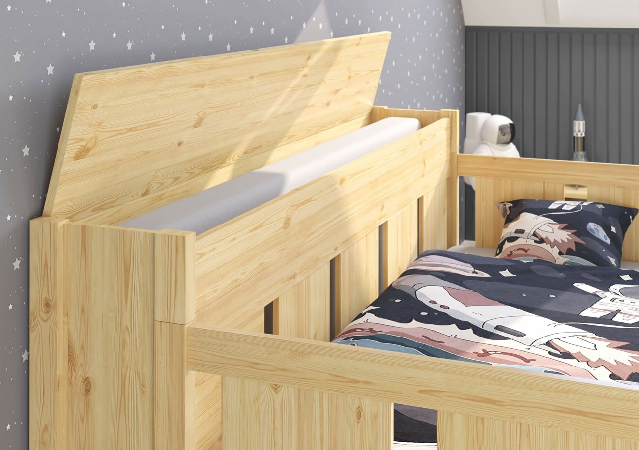 Το κρεβάτι είναι κατασκευασμένο από μασίφ ξύλο πεύκου με πάχος 25 – 28 mm, το οποίο εγγυάται τη σταθερότητα και τη μεγάλη διάρκεια ζωής του.