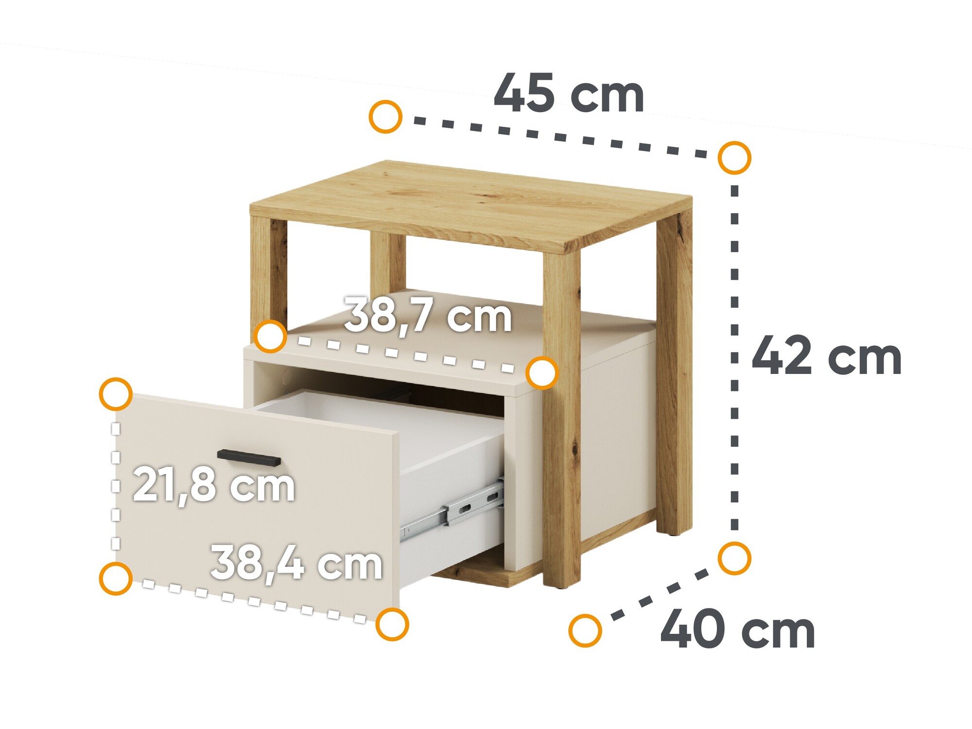 - Εξωτερική Διάσταση Κομοδίνου: Μήκος 45cm x Πλάτος 40cm x Ύψος 42cm