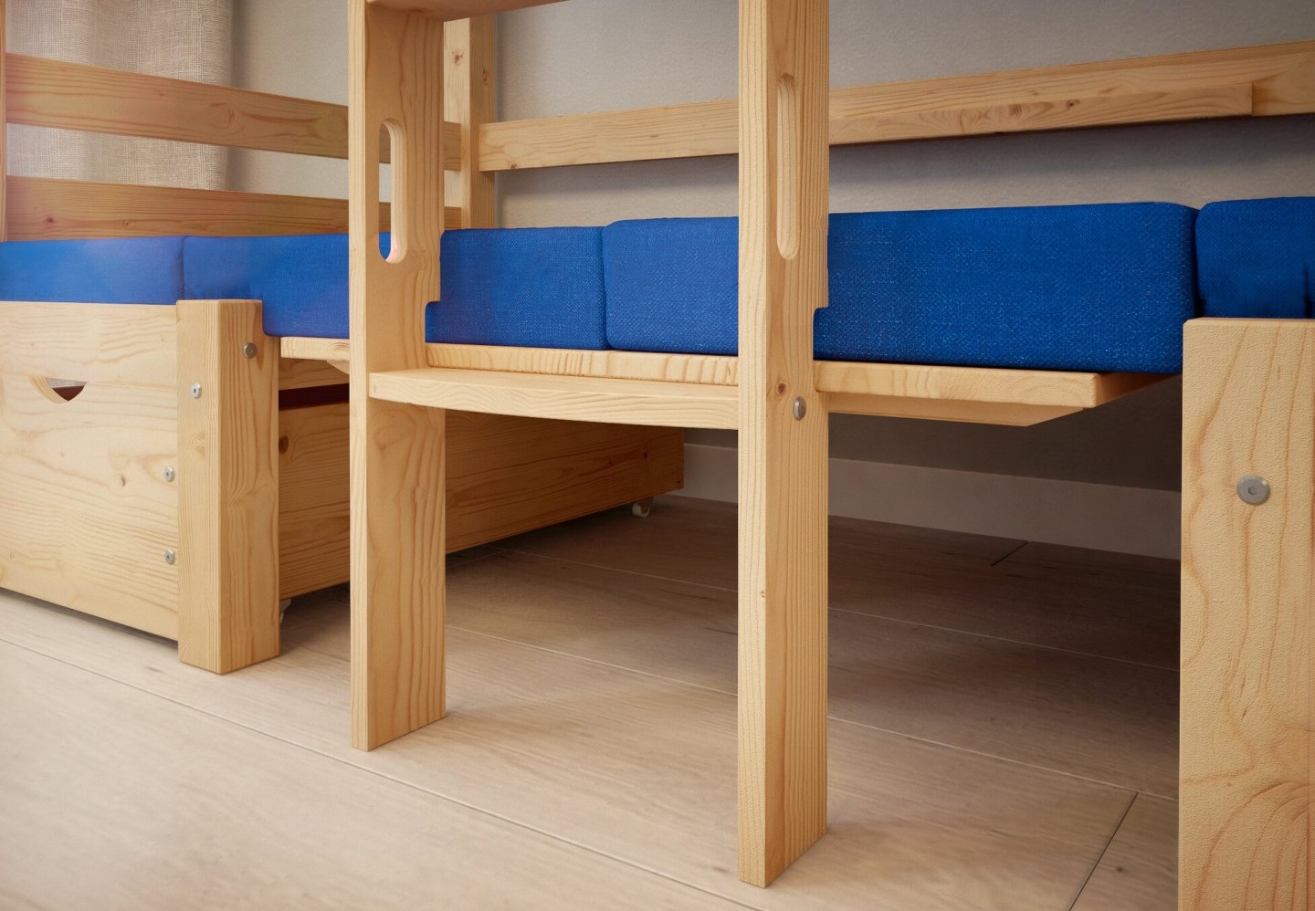 Χάρη στον καινοτόμο σχεδιασμό του, το κάτω μέρος του κρεβατιού μπορεί να διπλωθεί για να δημιουργήσει ένα ευρύχωρο τραπέζι για διάβασμα, σχέδιο ή παιχνίδι. Μια πολύ βολική λύση σε ένα παιδικό δωμάτιο, εξαλείφοντας την ανάγκη για ένα επιπλέον έπιπλο και αυξάνοντας τον ελεύθερο χώρο στο δωμάτιο. Προτεινόμενη κουκέτα για παιδιά. Μια εξαιρετική λύση για μικρά παιδικά δωμάτια.