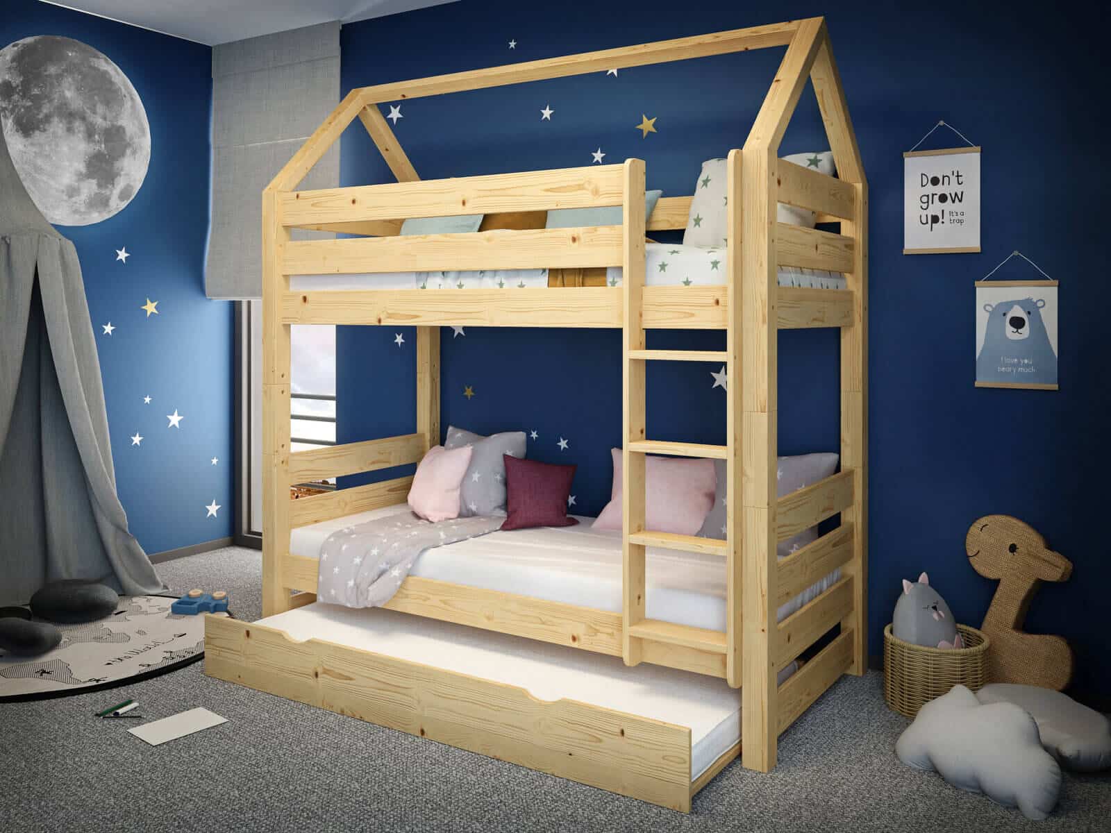 Παράλληλα, η κουκέτα προσφέρει άνετο χώρο ύπνου για τρία παιδιά, γεγονός που την καθιστά ιδανική επιλογή για οικογένειες με περισσότερα παιδιά ή για δωμάτια φιλοξενίας. Η ιδιαίτερη αισθητική της μετατρέπει το κρεβάτι σε ένα όμορφο σημείο του δωματίου που συνδυάζει παιχνίδι και ξεκούραση.