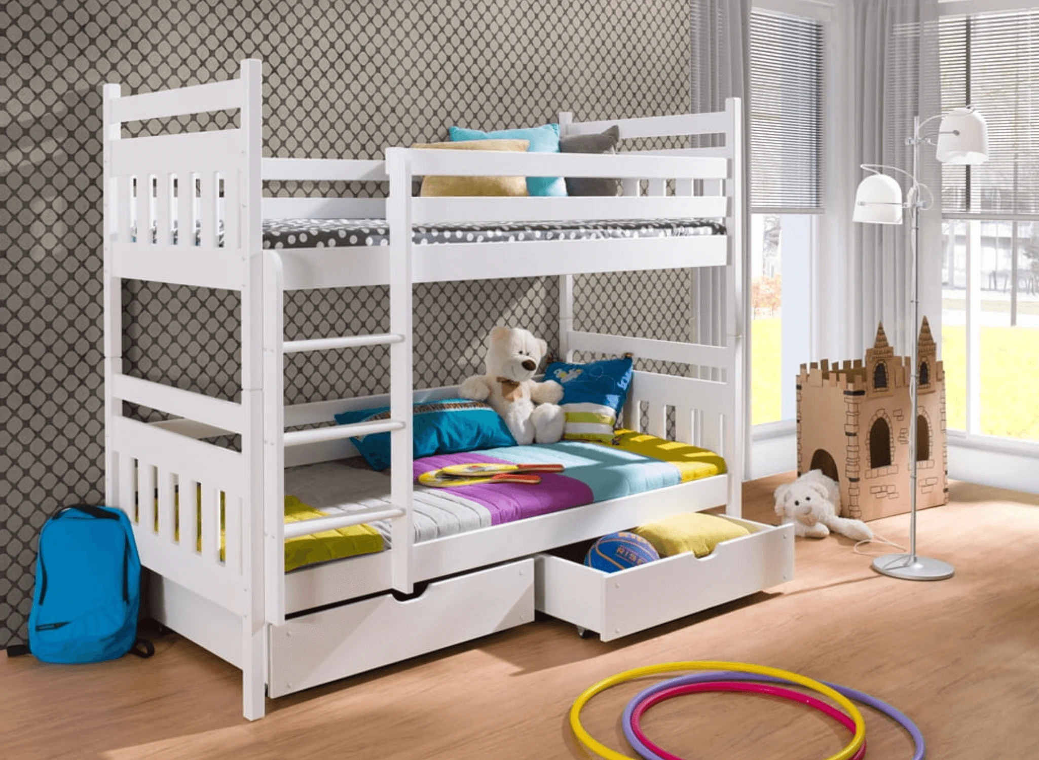 Επιπλέον, η κουκέτα Adas διαθέτει πρακτικά συρτάρια αποθήκευσης, ώστε να οργανώνετε εύκολα ρούχα, παιχνίδια και κλινοσκεπάσματα. Έτσι, διατηρείτε το δωμάτιο πάντα τακτοποιημένο και λειτουργικό.