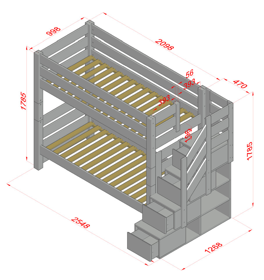 - Εξωτερική Διάσταση Κουκέτας με τα Σκαλοπάτια: Μήκος 256,8cm x Πλάτος 126,8cm x Ύψος 228,4cm