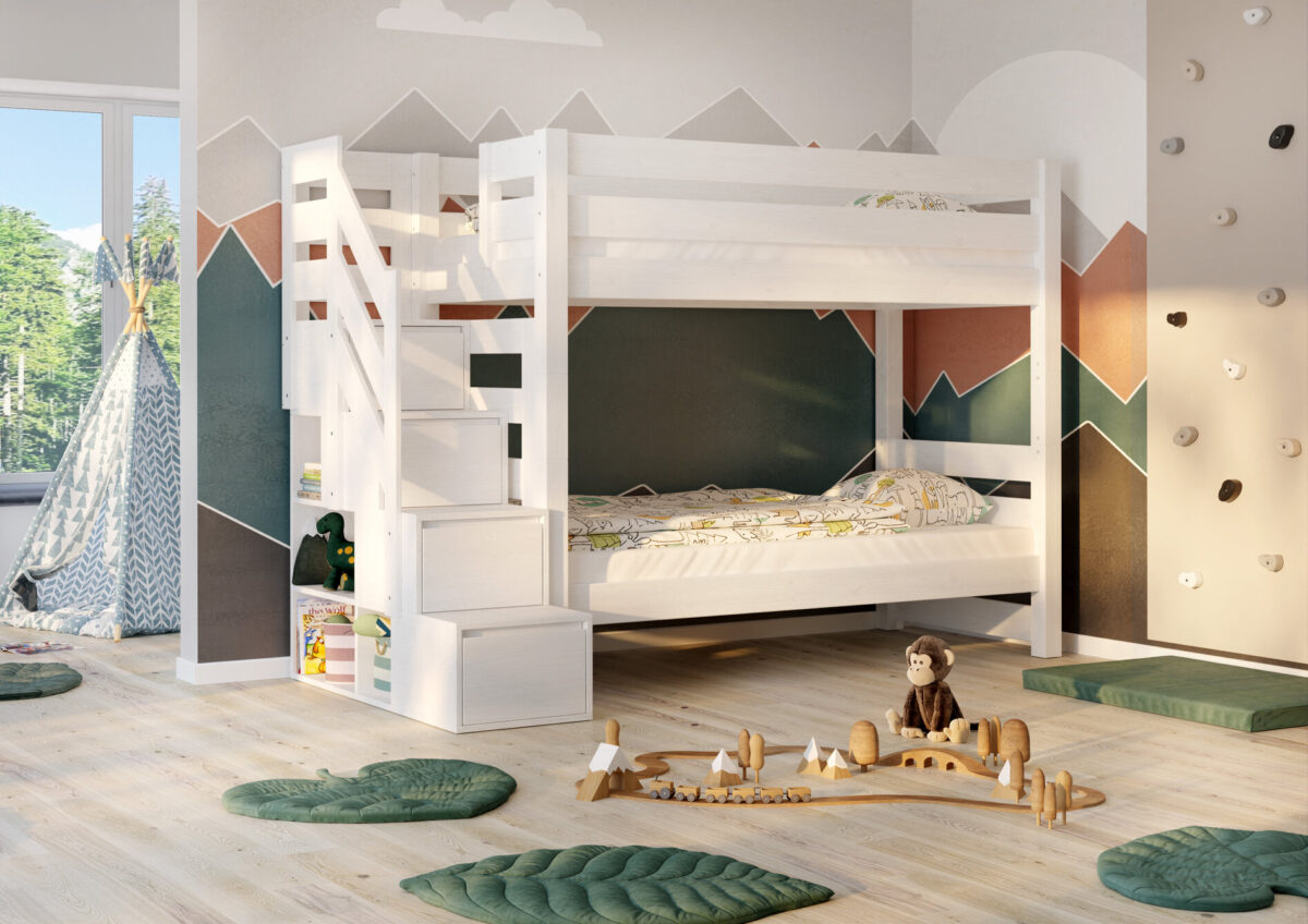 Επιπλέον, διαθέτει σκαλοπάτια με ενσωματωμένο αποθηκευτικό χώρο, τα οποία προσφέρουν εύκολη και ασφαλή πρόσβαση στο επάνω κρεβάτι. Τα πρακτικά αυτά συρτάρια μπορούν να χρησιμοποιηθούν για την αποθήκευση παιχνιδιών, βιβλίων ή άλλων αντικειμένων, συμβάλλοντας στην καλύτερη οργάνωση του παιδικού δωματίου.