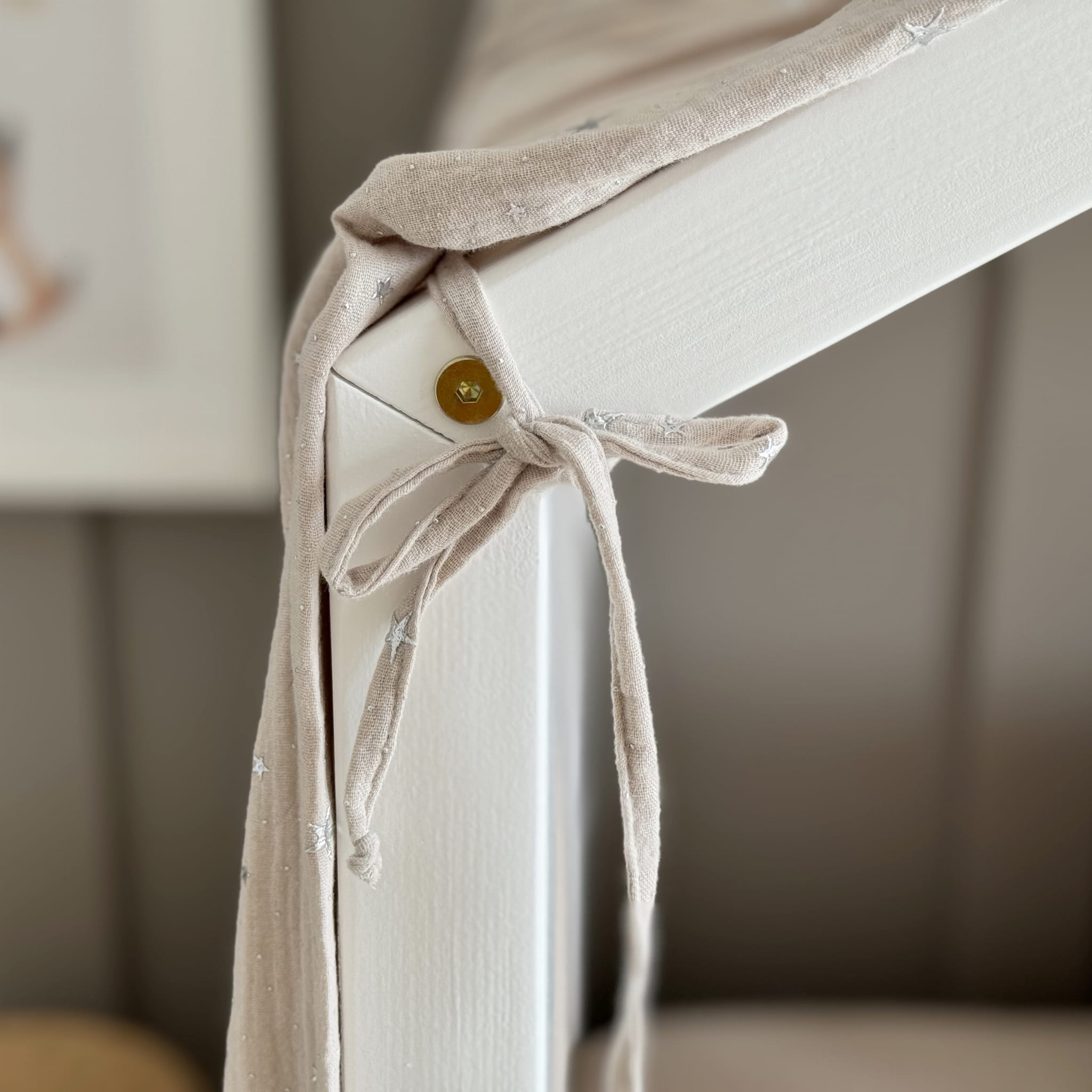 Υπάρχουν κορδόνια στο ίδιο χρώμα για να δένουν στο δοκάρι του κρεβατιού.
