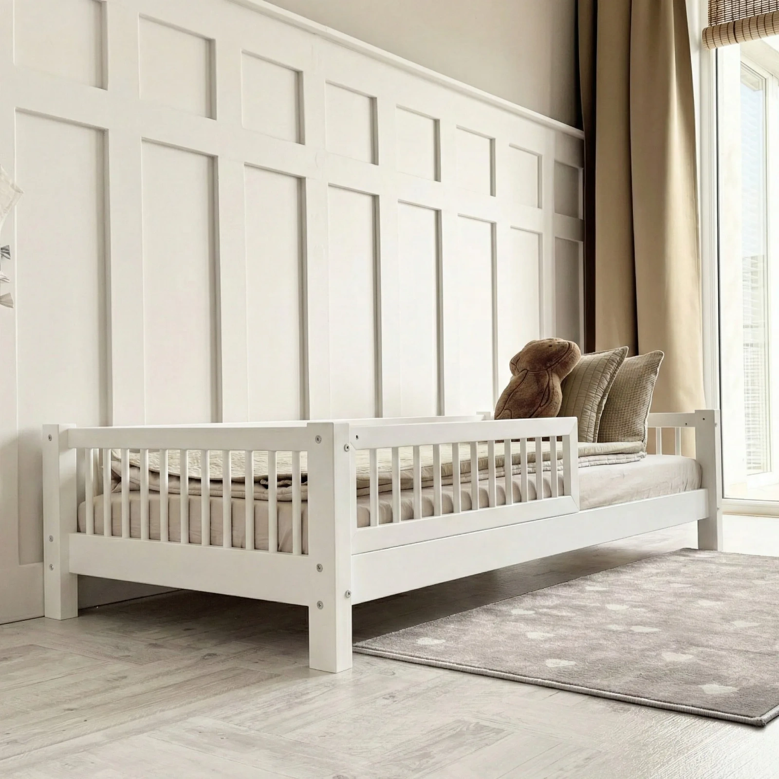 - Το κρεβάτι έχει στάνταρ αποσπώμενο μπροστινό κιγκλίδωμα κατά το 1/2 του μήκους του κρεβατιού.