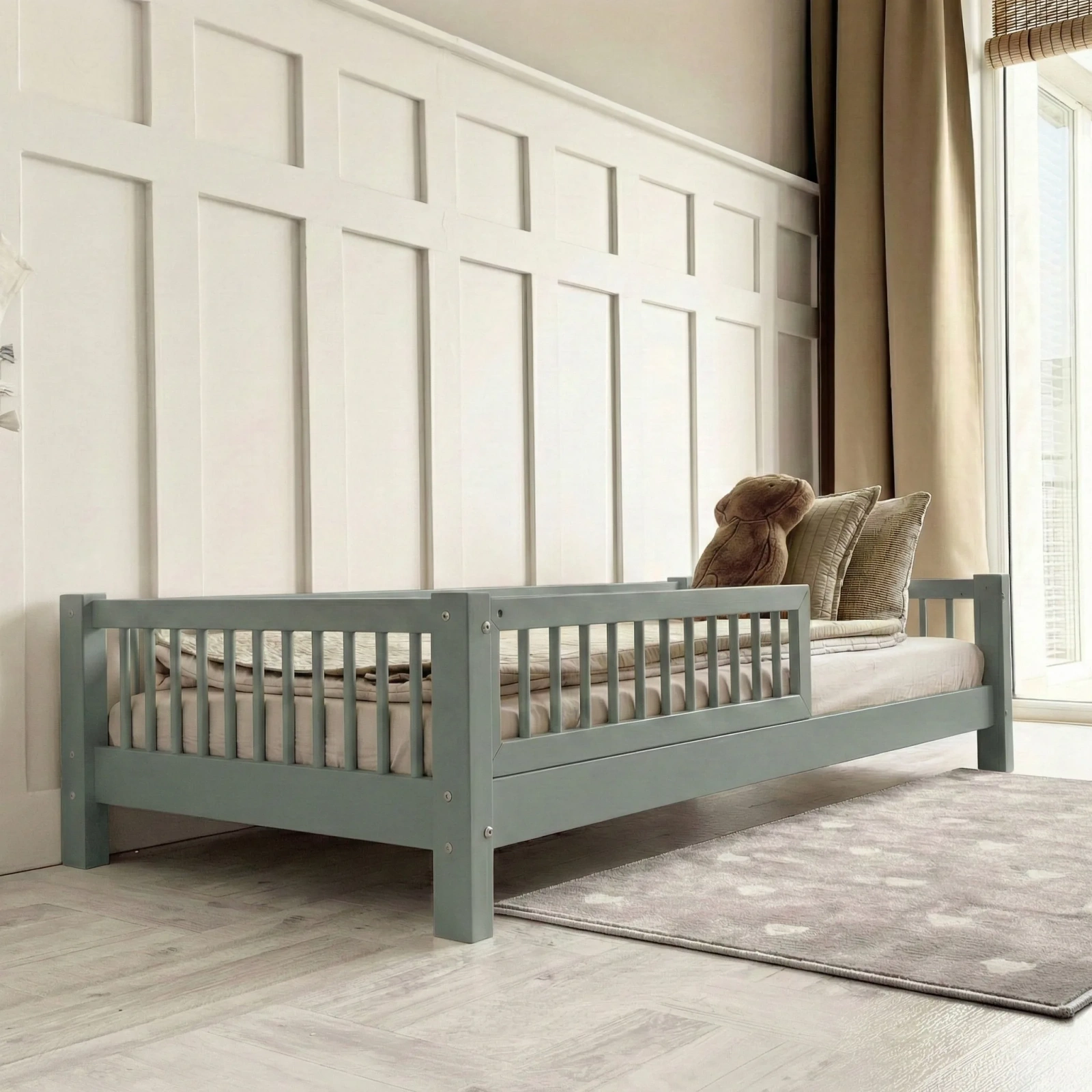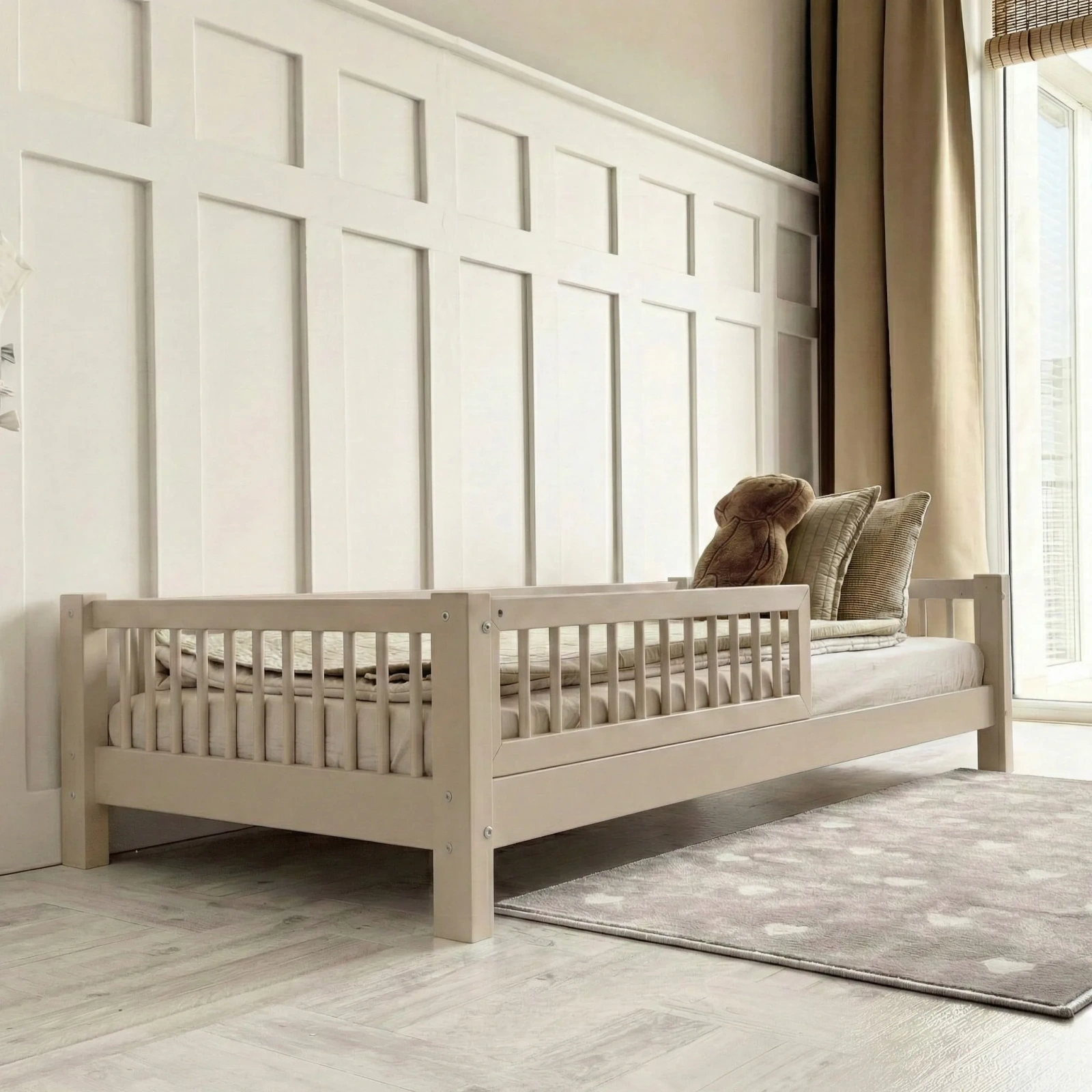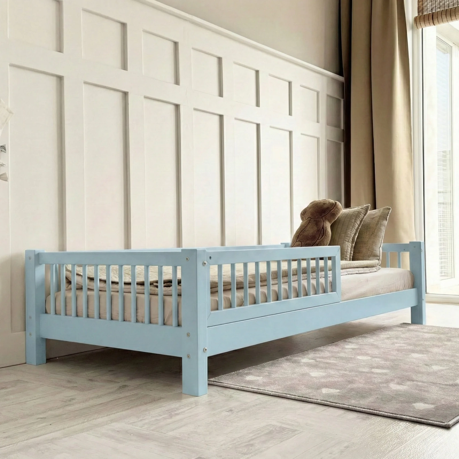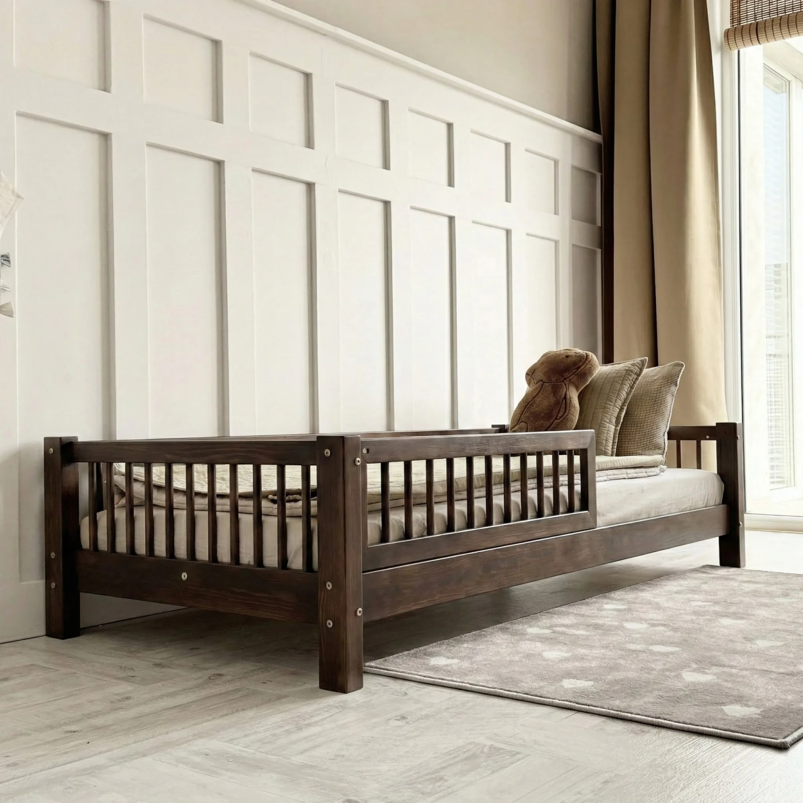 - Υλικό κατασκευής κρεβατιού: Κατασκευασμένο από μασίφ ξύλο πεύκου υψηλής ποιότητας, με αντοχή στην καταπόνηση και την φθορά.