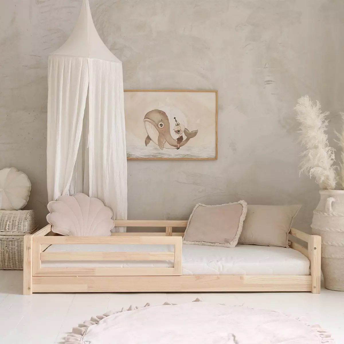 Το Montessori Basic Fello μασίφ πεύκο 140×200 διαθέτει αφαιρούμενα κάγκελα και αποσπώμενο μπροστινό κιγκλίδωμα, επιτρέποντας προσαρμογή καθώς μεγαλώνει το παιδί. Η στιβαρή κατασκευή υποστηρίζει βάρος έως 100kg και προσφέρει σταθερό περιβάλλον ύπνου.