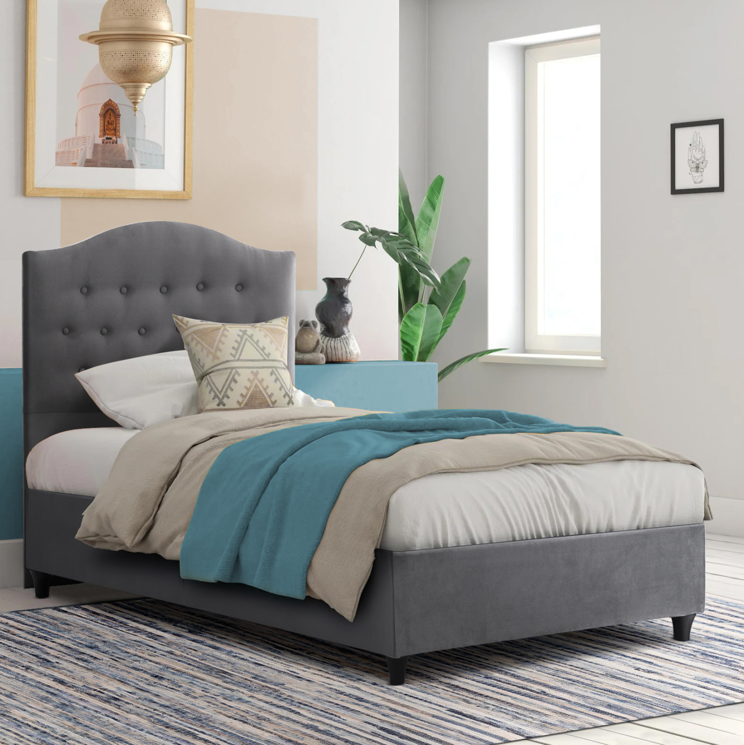 - Υλικό κατασκευής: Το κρεβάτι είναι κατασκευασμένο από ξύλο, πράγμα που του δίνει στιβαρότητα και αντοχή στον χρόνο. Η επένδυση έχει γίνει εξολοκλήρου από βελούδινο ύφασμα εξαιρετικής ποιότητας, χαρίζοντας ελκυστική όψη και μια εκλεπτυσμένη γοητεία στην διακόσμηση του υπνοδωματίου.