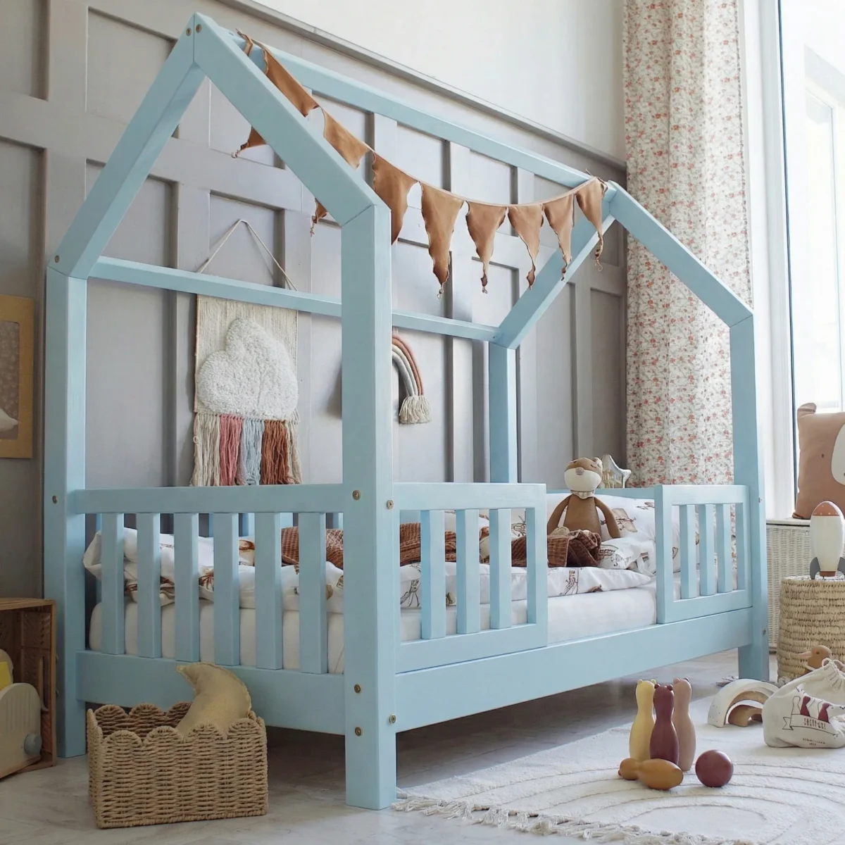 Ο ιδιαίτερος σχεδιασμός σε μορφή σπιτιού δημιουργεί ένα ζεστό και φιλικό περιβάλλον, μετατρέποντας το κρεβάτι σε έναν χώρο όχι μόνο για ύπνο αλλά και για παιχνίδι, χαλάρωση και δημιουργική απασχόληση.