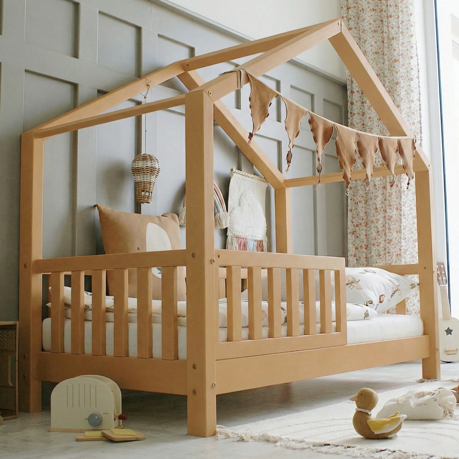 Το Κρεβάτι Montessori House Bed Toffee είναι ένα χαμηλό παιδικό κρεβάτι σε σχέδιο σπιτιού, βασισμένο στη φιλοσοφία Montessori, που ενθαρρύνει το παιδί να αυτοεξυπηρετείται και να κινείται ελεύθερα από μικρή ηλικία.