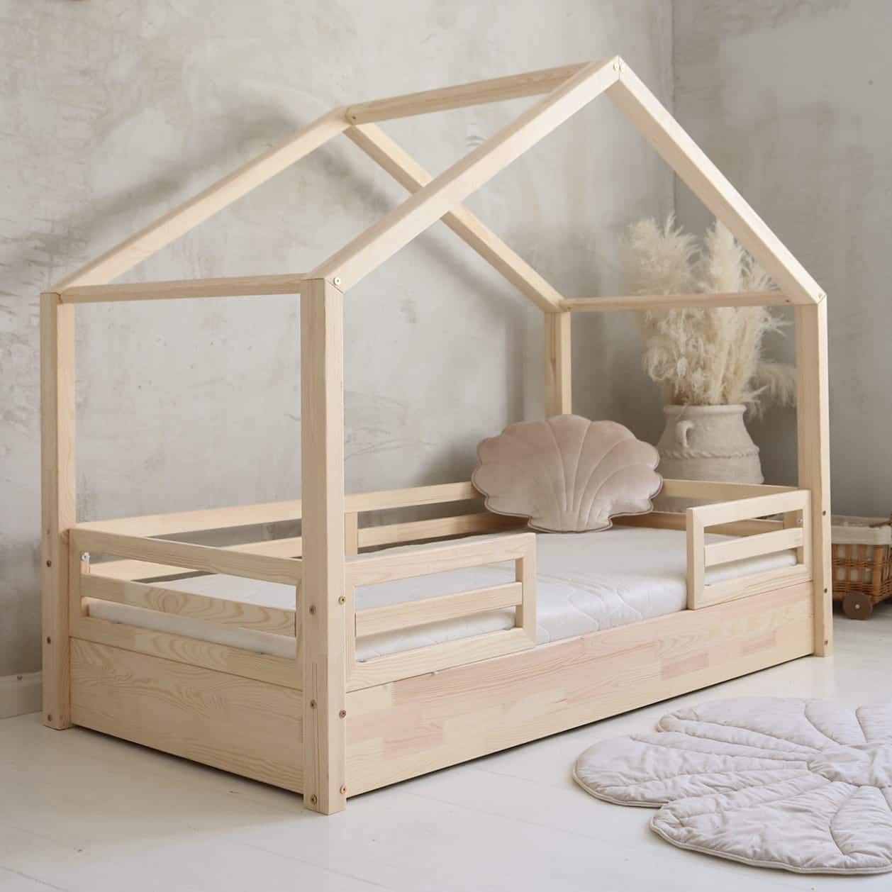 ο κρεβάτι Montessori House Fello από μασίφ ξύλο πεύκου είναι ένα χαμηλό παιδικό κρεβάτι με σχέδιο σπιτάκι, σχεδιασμένο σύμφωνα με τη μοντεσσοριανή φιλοσοφία. Το χαμηλό ύψος του επιτρέπει στο παιδί να ανεβαίνει και να κατεβαίνει μόνο του με ασφάλεια, ενισχύοντας την αυτονομία και την αυτοπεποίθησή του.