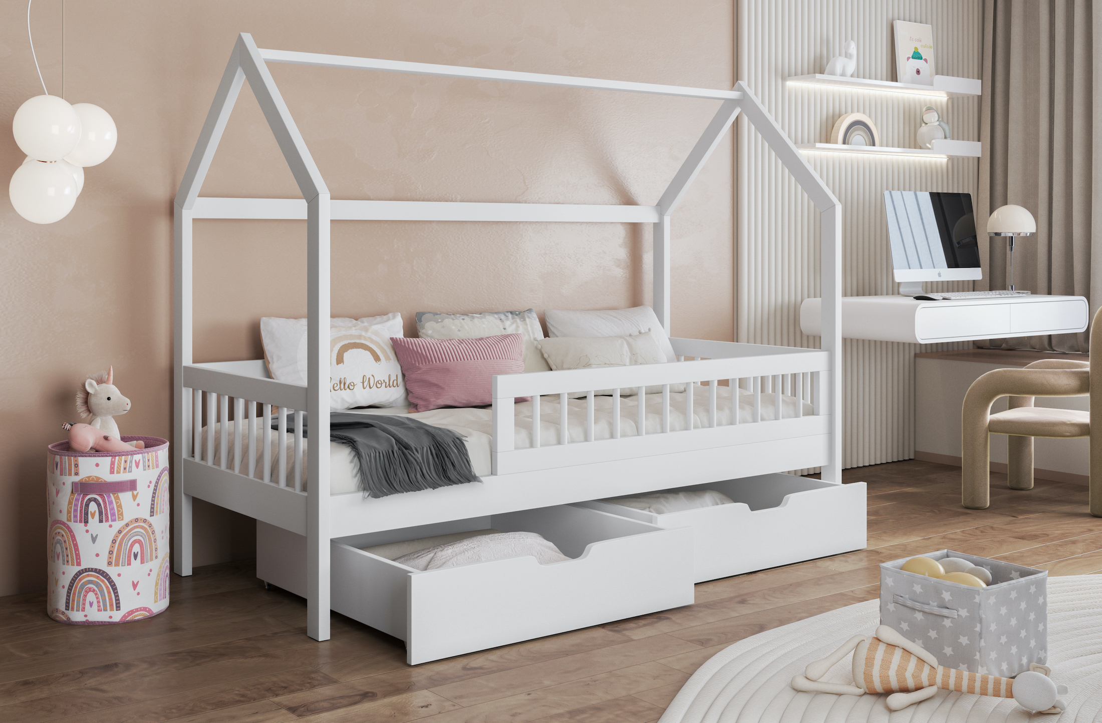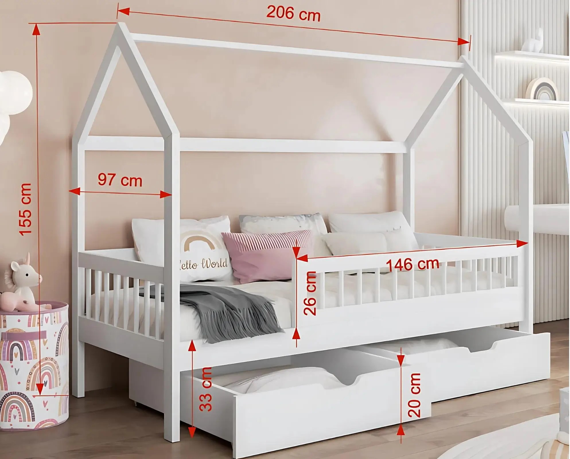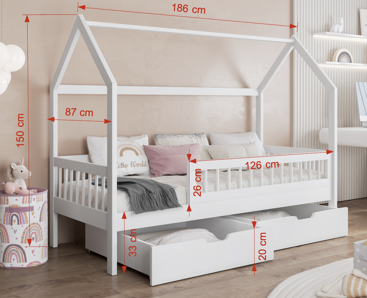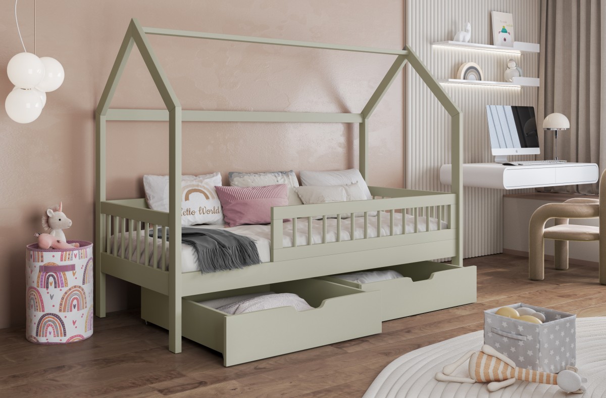 Το Κρεβάτι Σπιτάκι Gaja είναι ένα παραμυθένιο παιδικό κρεβάτι σε σχήμα σπιτιού, ιδανικό για να προσφέρει στο παιδί σας έναν ασφαλή και ονειρικό χώρο ύπνου. Το κρεβάτι διαθέτει δύο ευρύχωρα συρτάρια με ρόδες, όπου μπορείτε να αποθηκεύσετε κλινοσκεπάσματα, παιχνίδια ή άλλα απαραίτητα. Η ασφάλεια των παιδιών εξασφαλίζεται από προστατευτικά φράγμα , τα οποίο καταλαμβάνει τα 3/4 του μήκους του κρεβατιού.