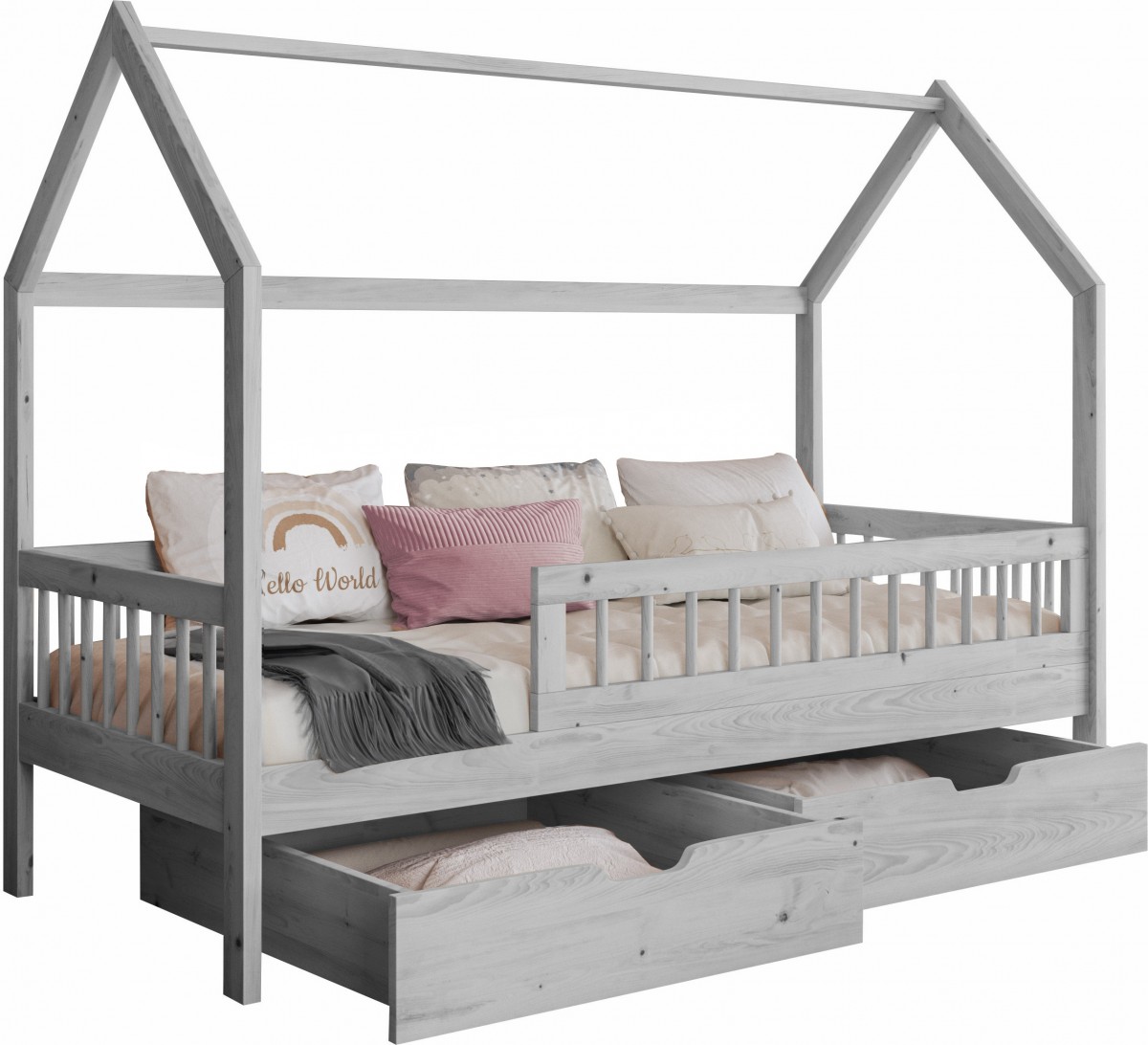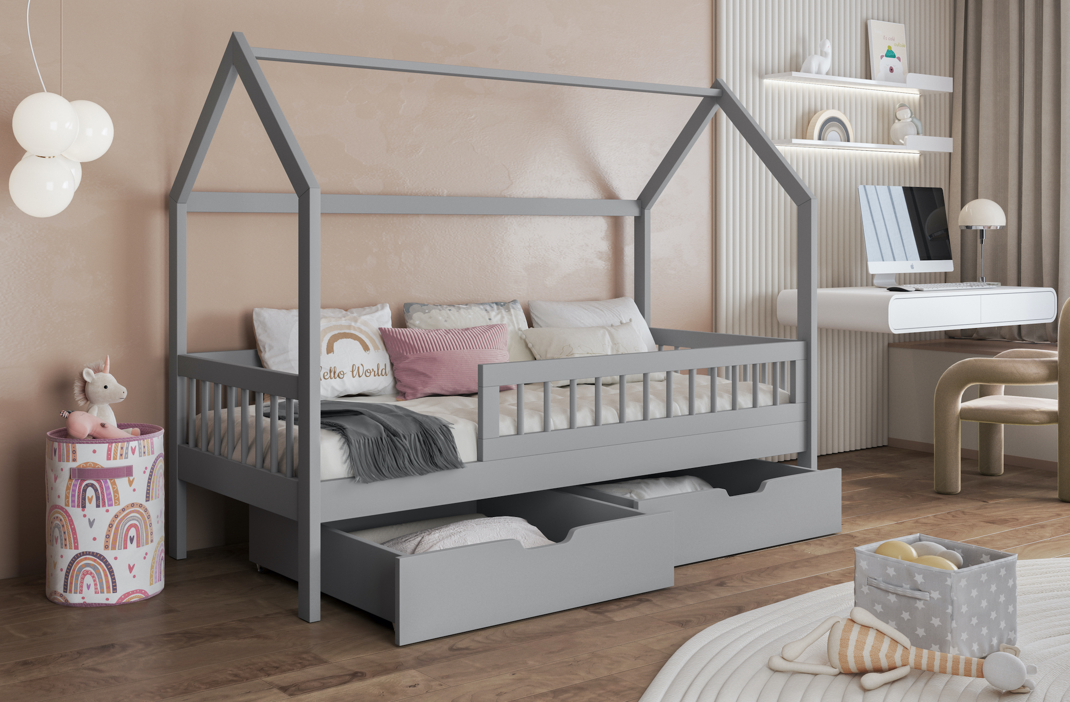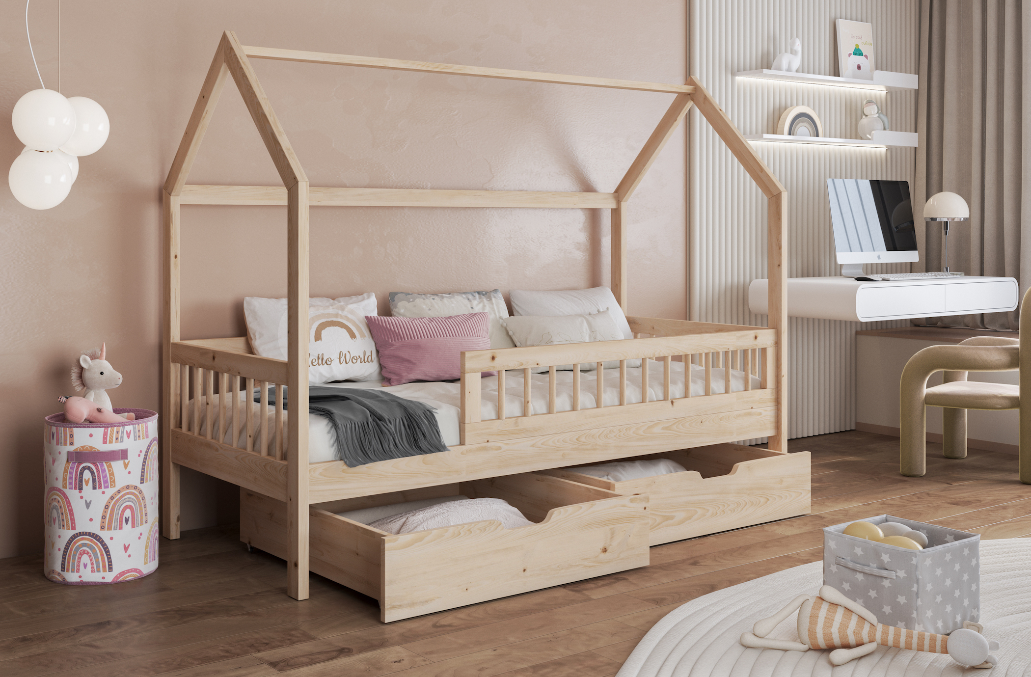 Το Κρεβάτι Σπιτάκι Gaja είναι ένα παραμυθένιο παιδικό κρεβάτι σε σχήμα σπιτιού, ιδανικό για να προσφέρει στο παιδί σας έναν ασφαλή και ονειρικό χώρο ύπνου. Το κρεβάτι διαθέτει δύο ευρύχωρα συρτάρια με ρόδες, όπου μπορείτε να αποθηκεύσετε κλινοσκεπάσματα, παιχνίδια ή άλλα απαραίτητα. Η ασφάλεια των παιδιών εξασφαλίζεται από προστατευτικά φράγμα , τα οποίο καταλαμβάνει τα 3/4 του μήκους του κρεβατιού.