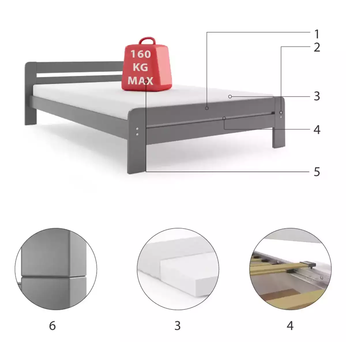 προϊόν Κρεβάτι Dallas Graphite από ξύλο πεύκου με στρώμα 120x200x9cm