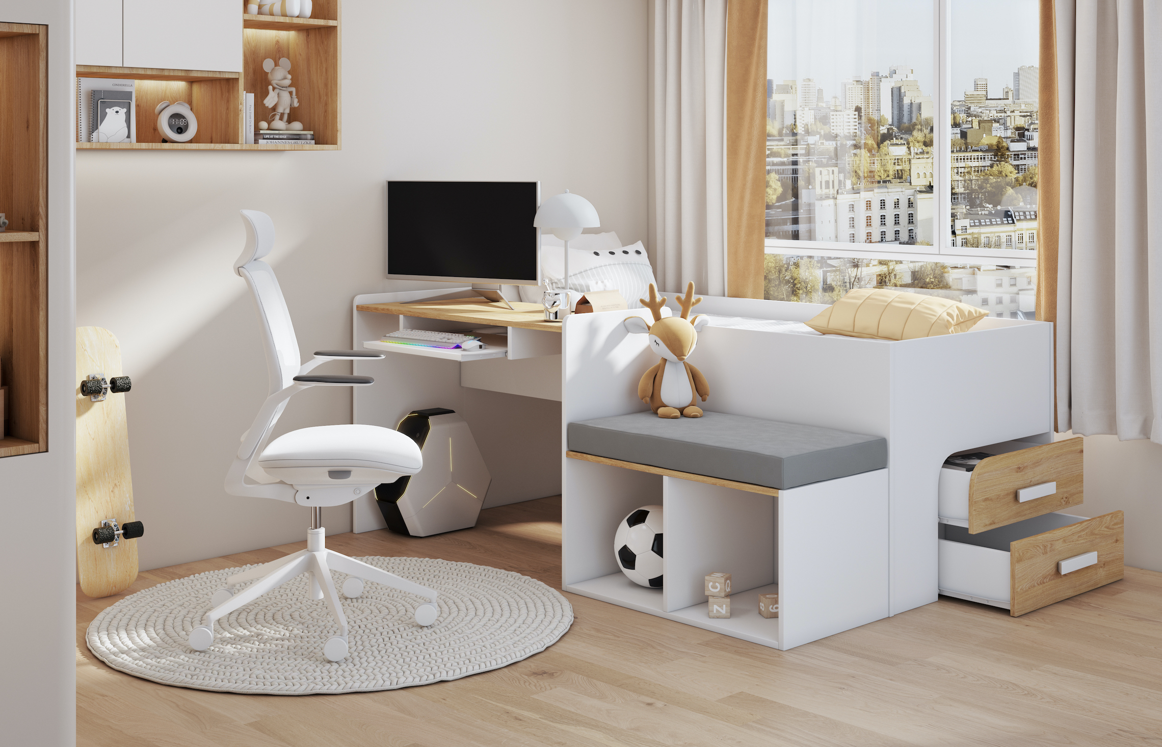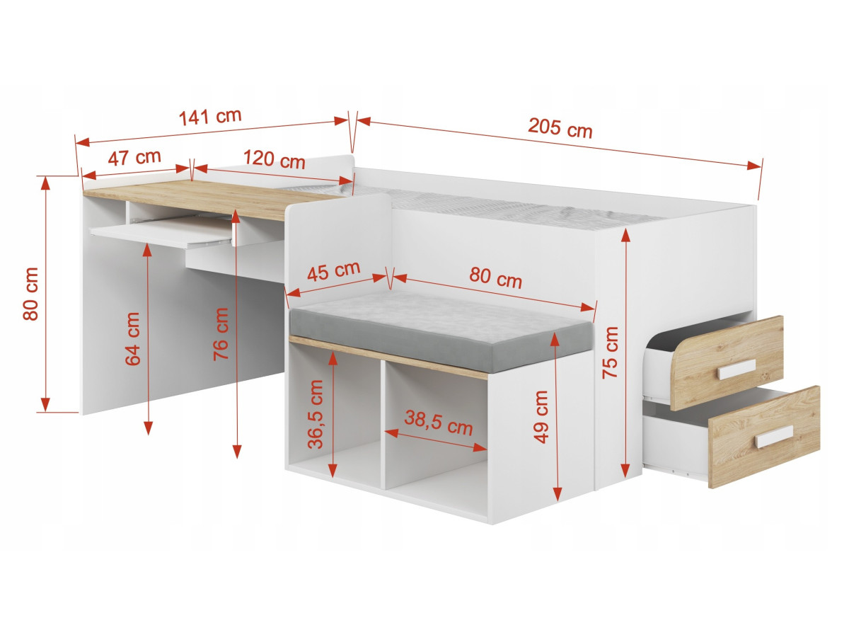 Το κρεβάτι Megan με γραφείο είναι η ιδανική επιλογή για μικρούς χώρους όπου κάθε εκατοστό χώρου μετράει. Αυτό το πολυλειτουργικό έπιπλο συνδυάζει έναν άνετο χώρο ύπνου με ένα εργονομικό γραφείο και χώρο εργασίας. Ένα επιπλέον πλεονέκτημα είναι τα ευρύχωρα συρτάρια που παρέχουν επιπλέον αποθηκευτικό χώρο.