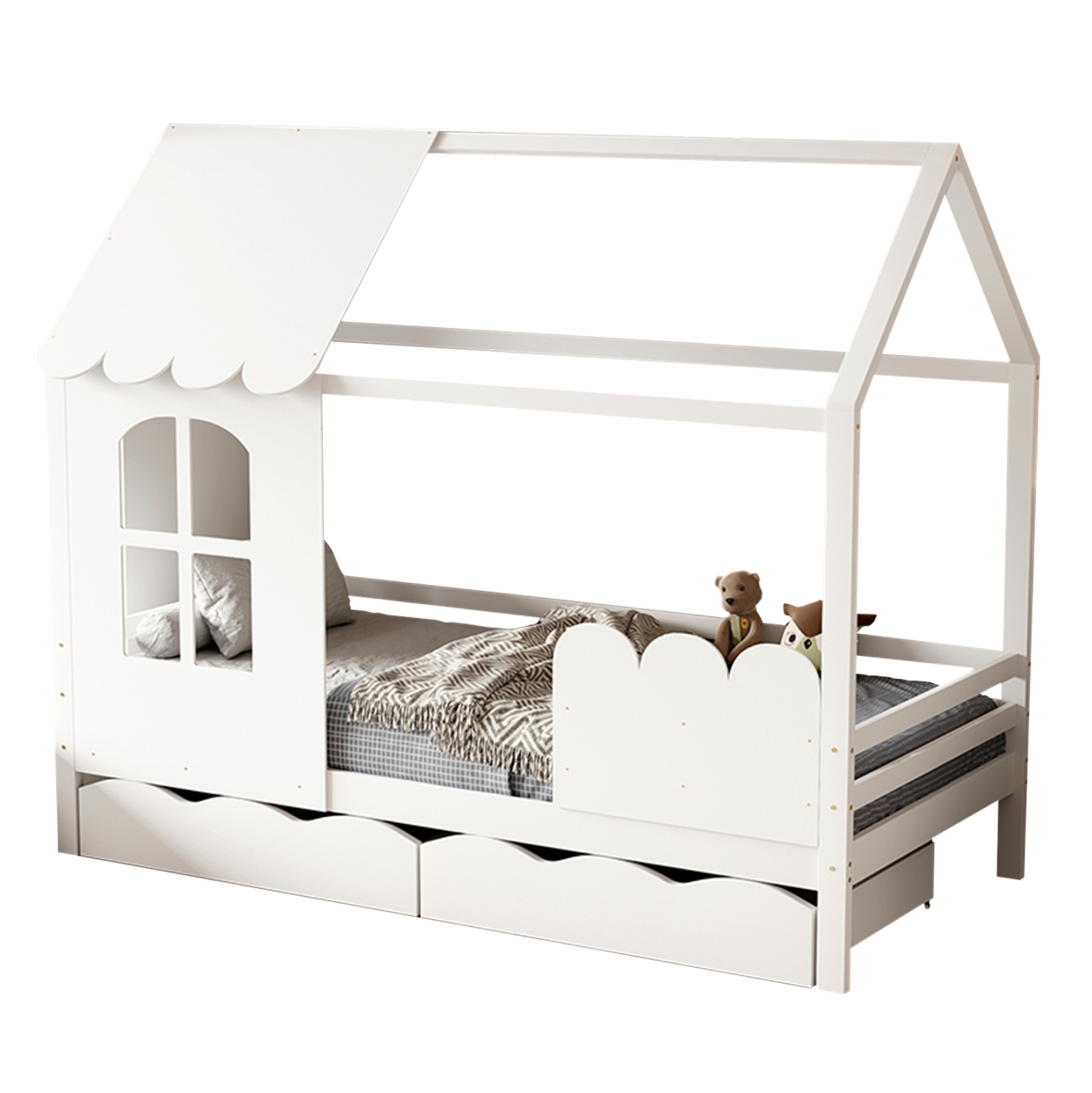 Το DOMER είναι ακόμα ένα καινούργιο παιδικό κρεβάτι τύπου Montessori που σημαίνει ότι έχει σχεδιαστεί σύμφωνα με το εκπαιδευτικό σύστημα Montessori, κατά το οποίο τα παιδιά μαθαίνουν καλύτερα, όταν επιλέγουν μόνα τους τι θα κάνουν. Το χαμηλό ύψος κρεβατιού χωρίς πόδια, βοηθά να εξερευνούν την αυτονομία τους και να ανεβοκατεβαίνουν από το κρεβάτι τους ελεύθερα ανά πάσα στιγμή. Είναι σε διάσταση για μονό στρώμα 90×190 εκ, και αποτελεί μια άριστης ποιότητας, μοντέρνα και ασφαλή επιλογή για το παιδικό δωμάτιο. Είναι ξύλινο σε ΛΕΥΚΟ χρώμα βαμμένο με αβλαβές μη τοξικό βερνίκι με βάση το νερό, ιδανικό για παιδιά. Το στρώμα τοποθετείται σε τάβλες κατασκευασμένες από ξυλεία κόντρα πλακέ. Ολόκληρο το κρεβάτι έχει σχήμα σπιτιού με παραθυράκι, που θα δώσει μια ευχάριστη, «ζεστή», και παιχνιδιάρικη όψη σε κάθε παιδικό δωμάτιο. Πέρα, όμως, από ευχάριστο στην όψη, αυτό το κρεβάτι είναι και πρακτικό αφού διαθέτει 2 μεγάλα συρτάρια στην κάτω πλευρά, για να αποθηκεύετε οτιδήποτε χρειαστεί.