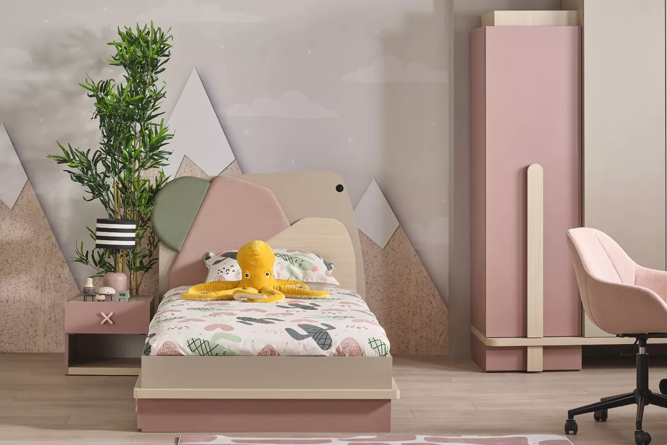 Το κεφαλάρι του έχει μοναδικό ασύμμετρο σχεδιασμό, συνδυάζοντας μπεζ, ροζ και πράσινες αποχρώσεις, ενώ περιλαμβάνει ενσωματωμένη θύρα USB για φόρτιση συσκευών. Στο κάτω μέρος του κρεβατιού υπάρχει ένα συρτάρι αποθήκευσης με χαρακτηριστικές “χιαστί” λαβές, προσφέροντας επιπλέον χώρο για οργάνωση στο δωμάτιό σας.