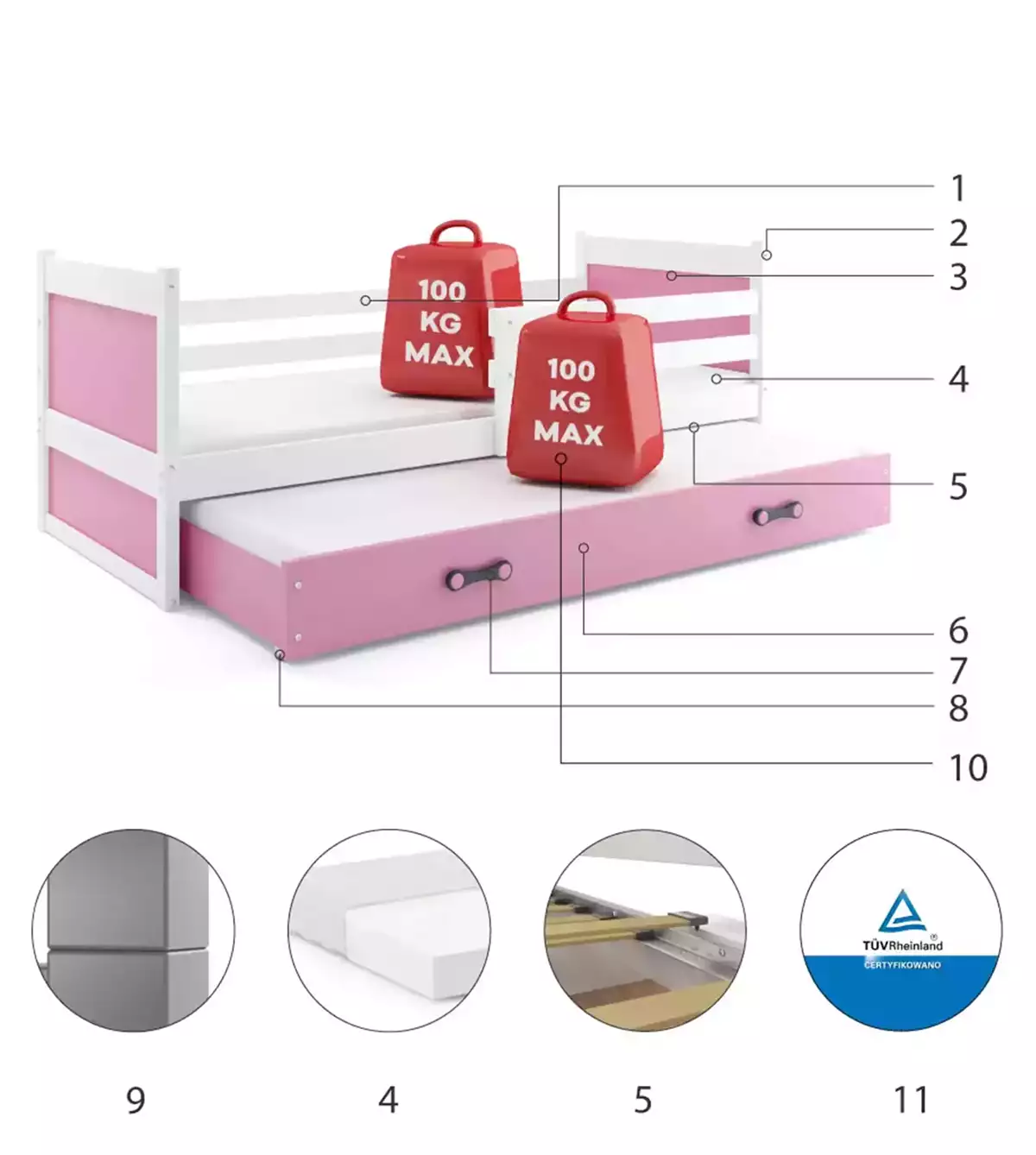 - Μέγιστη Αντοχή Βάρους: 100 Kg ανά κρεβάτι
