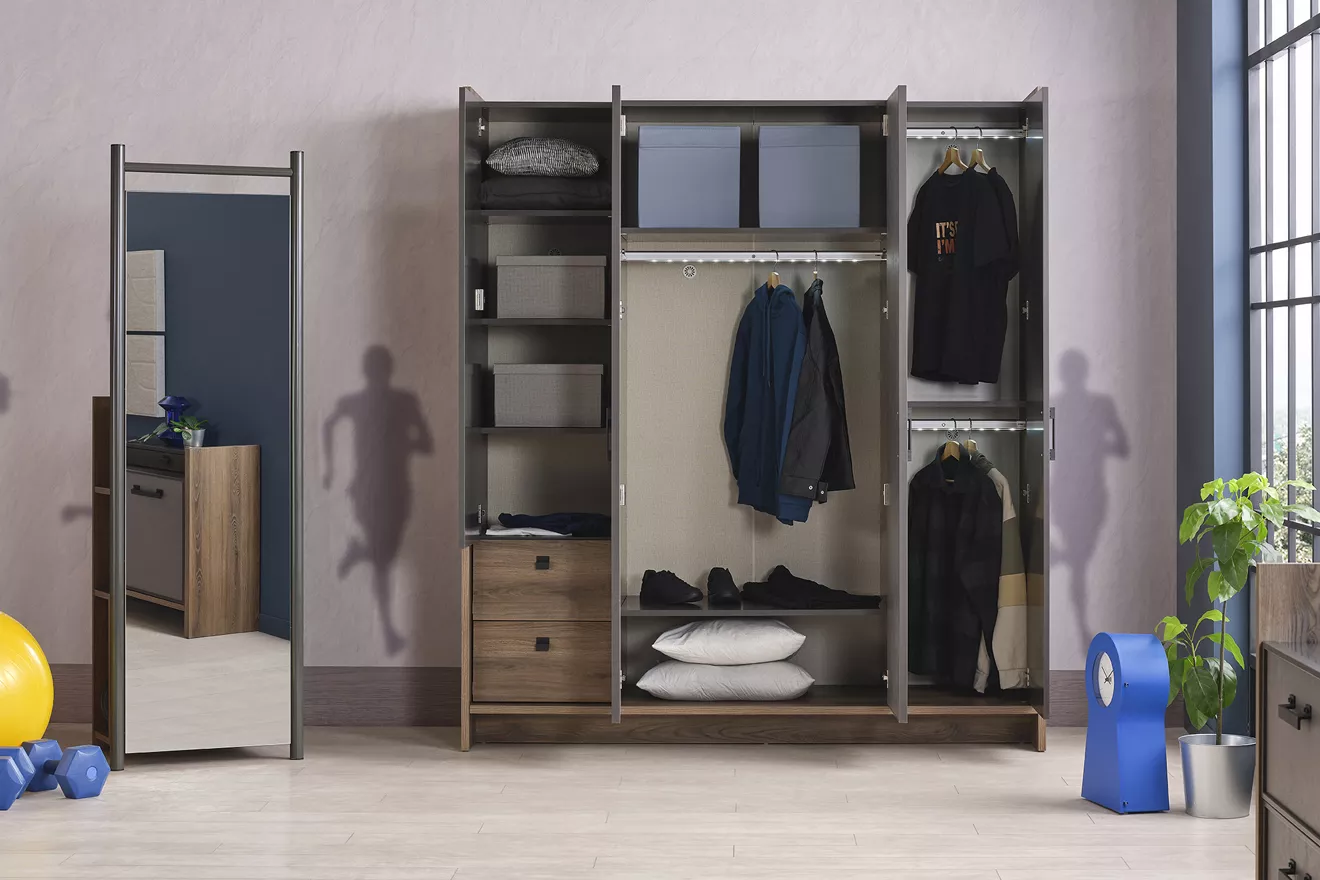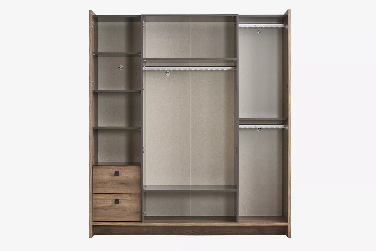 Η ανοιγόμενη 4φυλλη ντουλάπα της σειράς Action διαθέτει 4 ευρύχωρα ράφια για την τακτοποίηση του ρουχισμού αλλά και των λευκών ειδών. Δύο μεγάλα ράφια αποθήκευσης, μία μεγάλη φωτιζόμενη ράγα και δύο μικρότερες για κρεμαστά ρούχα, καθώς και δύο εσωτερικά συρτάρια.