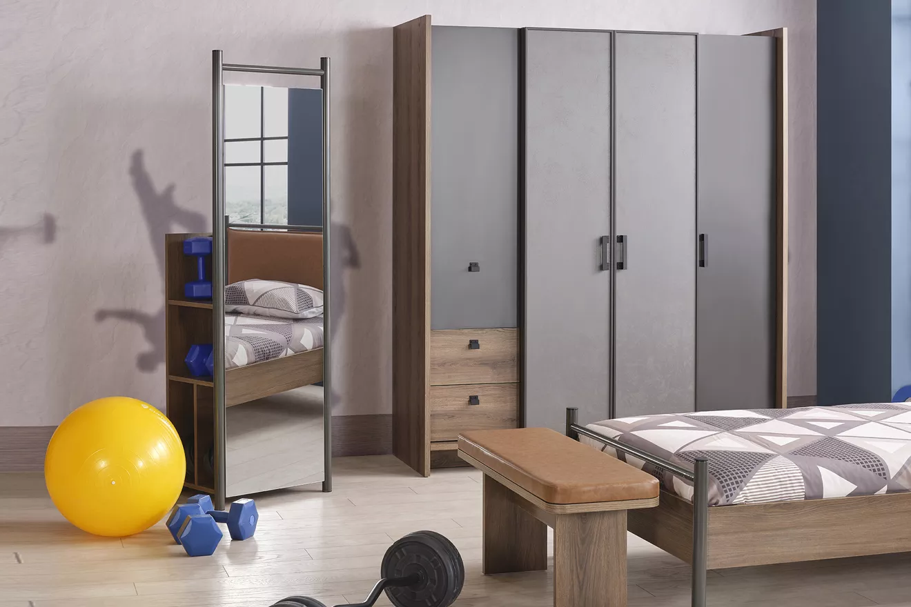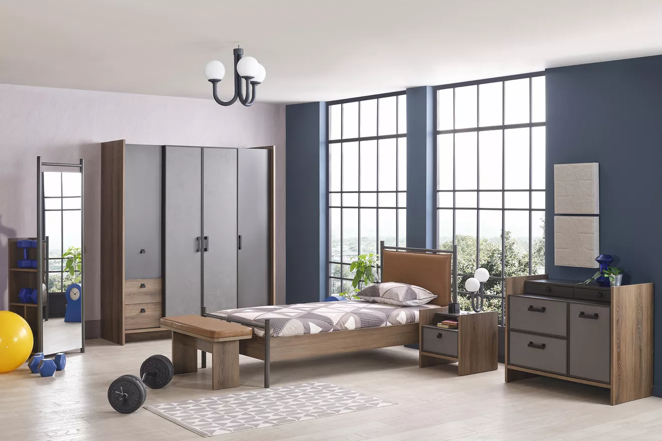Κάθε χώρος είναι εργονομικά σχεδιασμένος έτσι ώστε να εξυπηρετεί με τον καλύτερο δυνατό τρόπο τις ανάγκες ενός εφήβου. Η εντυπωσιακή όψη τσιμέντου στην επιφάνεια του ξύλου και τα μεταλλικά πόμολα, της χαρίζουν σύγχρονη πολυτέλεια που εντυπωσιάζει τους νέους.