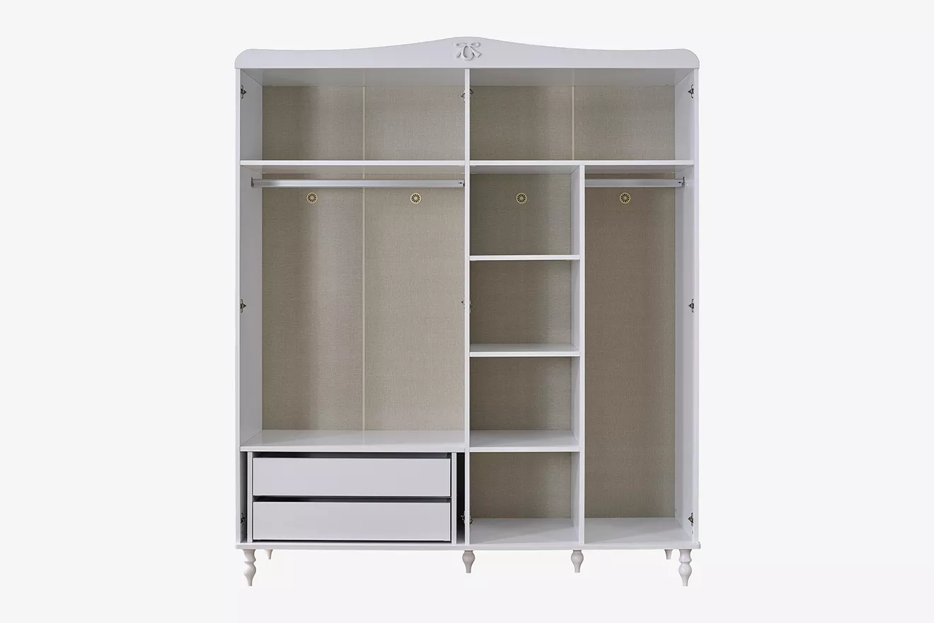 Η τετράθυρη ντουλάπα JULIETTE της Kupa εντυπωσιάζει με τον κομψό και διαχρονικό σχεδιασμό της. Κατασκευασμένη από λευκό ξύλο, τα καμπυλωτά πόδια, το καμπυλωτό γείσο και τα διακοσμητικά γείσα στις πόρτες υπογραμμίζουν το γοητευτικό στυλ της ντουλάπας. Στο εσωτερικό, επτά ευρύχωρα ράφια και μια ράγα ρούχων προσφέρουν άφθονο χώρο για ρούχα, λευκά είδη και αξεσουάρ. Η λειτουργία απαλού κλεισίματος εξασφαλίζει αθόρυβο, απαλό κλείσιμο των θυρών.
