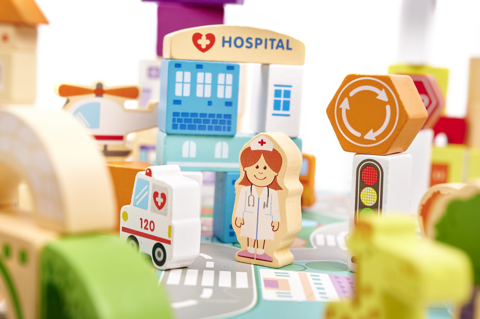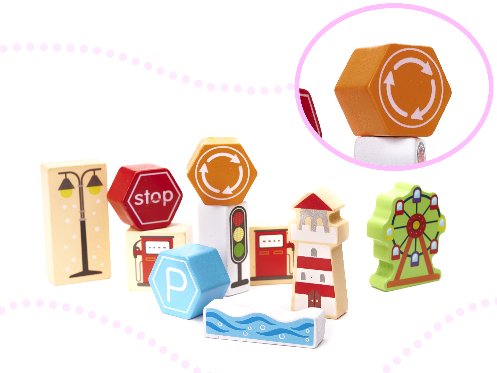 Η πόλη δεν μπορεί να λείπει από τα πιο σημαντικά – δρόμους και αυτοκίνητα . Το σετ συνοδεύεται από ένα παζλ με μια λωρίδα από δρόμους, που θα ολοκληρώσει το σύνολο. Το σετ από πολύχρωμα μπλοκ είναι μια πρόταση για δημιουργικό, αναπτυσσόμενο παιχνίδι.