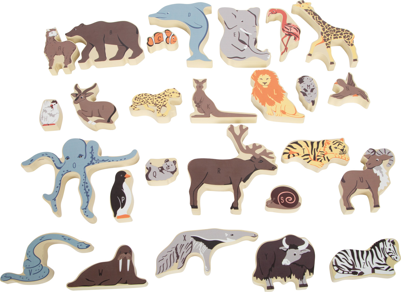 Ένα παζλ του κόσμου των ζώων! Ο στόχος αυτού του παζλ με έντονα χρώματα είναι να συνδυάσει τα 26 όμορφα σχεδιασμένα ξύλινα ειδώλια ζώων. Το αλπακά, το φλαμίνγκο, ο πιγκουίνος και οι φίλοι τους είναι πολύ παχύρρευστοι και κατασκευασμένοι από λείο ξύλο, καθιστώντας τους εύκολους να πιαστούν από τα χέρια των παιδιών και επιτρέποντάς τους να παίζονται μαζί τους χωριστά από το παζλ κατά τη διάρκεια παιχνιδιού γεμάτο φαντασία. Τα ζώα έχουν τυπωμένο το πρώτο γράμμα του ονόματός τους στα γερμανικά και στα αγγλικά, το οποίο βοηθά στη σωστή σειρά των κομματιών του παζλ. Είναι μια άγρια διασκέδαση με παζλ που υποστηρίζει τα παιδιά στην εκμάθηση γραμμάτων και ονομάτων ζώων. Η εκμάθηση του ABC είναι εύκολη! Αυτό το παζλ με ξύλινα ζώα προσφέρει την ευκαιρία να γνωρίσετε ζώα και γράμματα με διασκεδαστικό τρόπο ενώ ταυτόχρονα εκπαιδεύει λεπτές κινητικές δεξιότητες, συγκέντρωση και υπομονή. Ιδανικό για παιδιά (προσχολικής ηλικίας!