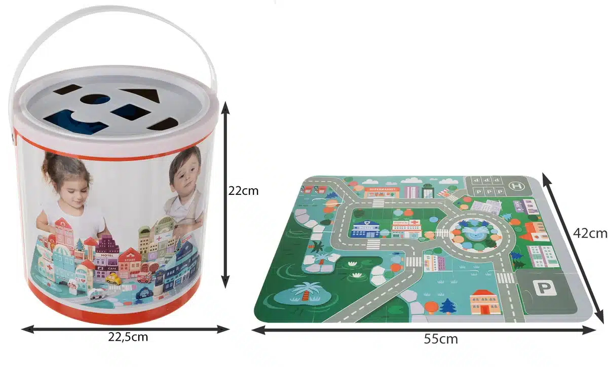 Το σετ περιλαμβάνει τουβλάκια με γράμματα, αριθμούς, σύμβολα, τουβλάκια που συνθέτουν κτίρια μια πόλης, ξύλινες φιγούρες ανθρώπων – οχημάτων, χαλάκι με τύπωμα δρόμων, πάρκων, κτιρίων. Επίσης συνοδεύεται από τσάντα και κουβαδάκι αποθήκευσης και μεταφοράς.