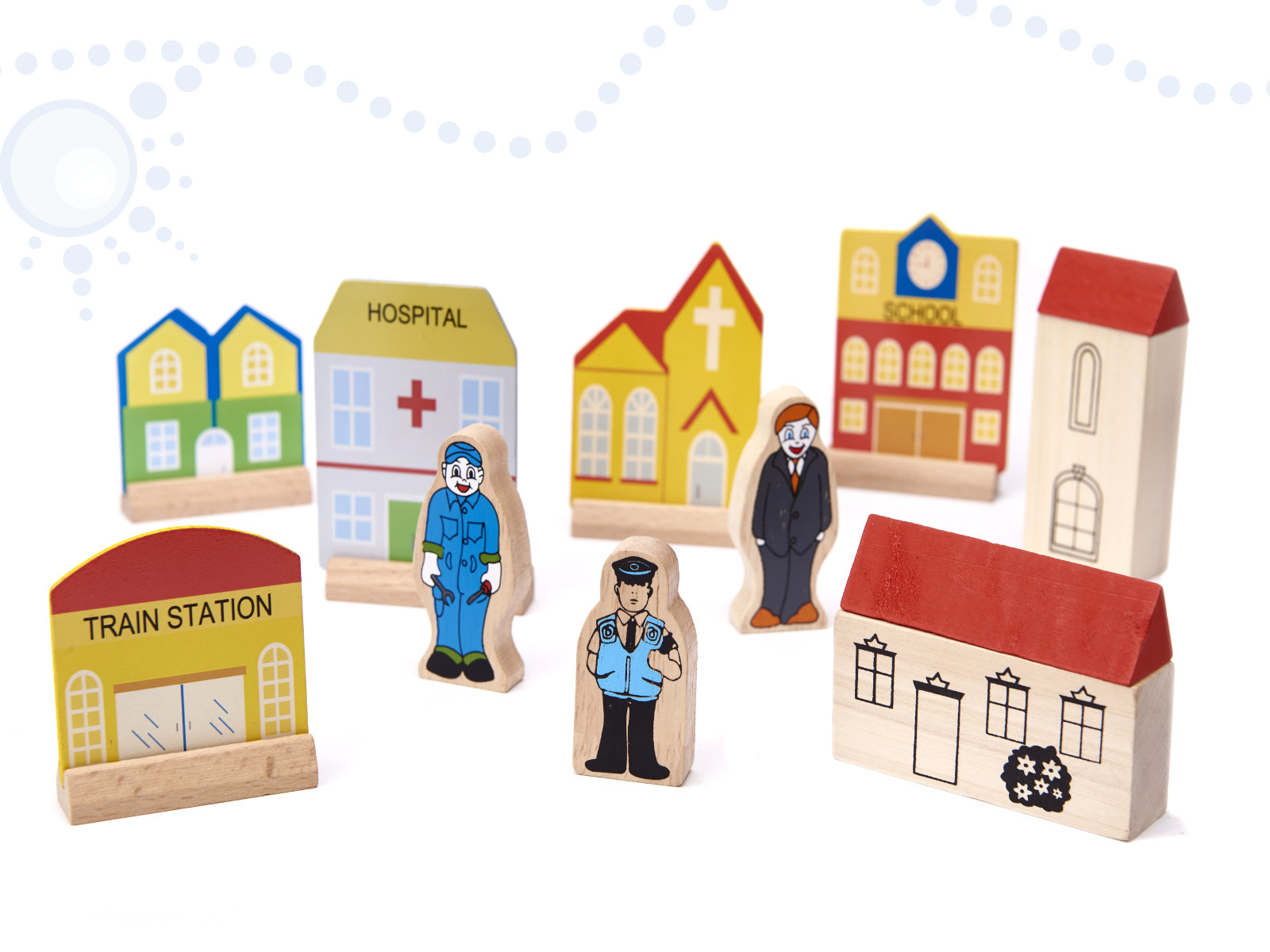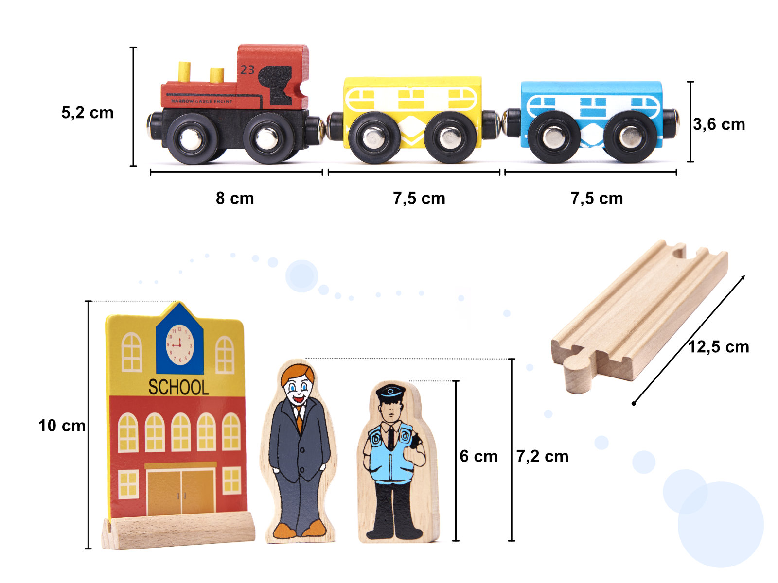 - Το σετ περιλαμβάνει: 22 μπλοκ για το στρώσιμο της πίστας, Γέφυρα, 8 πυλώνες, εμπόδια, 5 δέντρα, 8 οχήματα, μεταξύ άλλων, μια ατμομηχανή με δύο αυτοκίνητα, ένα ασθενοφόρο, ένα αυτοκίνητο της αστυνομίας, Νοσοκομείο, βενζινάδικο και άλλα στοιχεία αστικής ανάπτυξης, Οδικά σήματα, 3 φιγούρες