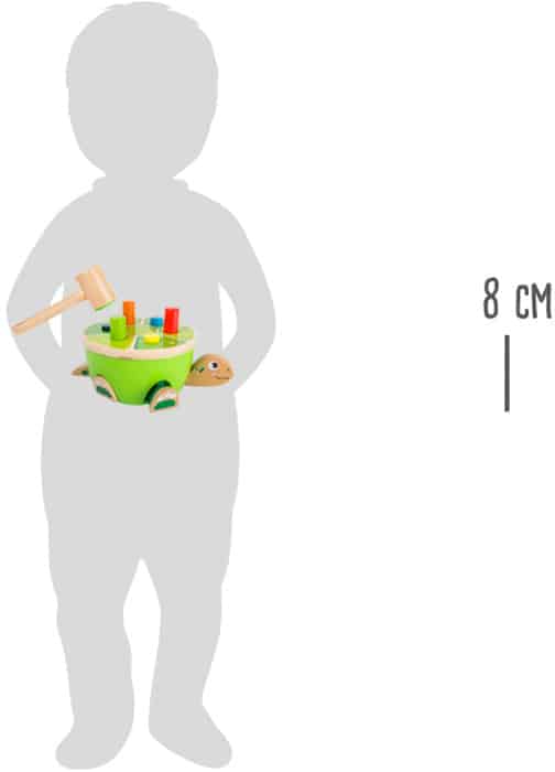 Προσοχή σε όλες τις χελώνες! Τα μικρά παιδιά μπορούν να αποδείξουν την ακρίβειά τους με αυτό το παιχνίδι. Το ξύλινο σφυρί είναι εξοπλισμένο με τσόχα για αθόρυβα χτυπήματα. Όταν χτυπηθεί ένα ξύλινο μανταλάκι, εμφανίζεται αυτόματα ένα άλλο. Και εδώ είναι το σπουδαίο: τα πόδια, το κεφάλι και η ουρά της χελώνας απλώνονται από κάθε μανταλάκι. Ένα ανόητο παιχνίδι κινητικών δεξιοτήτων με έναν επιπλέον διασκεδαστικό παράγοντα.