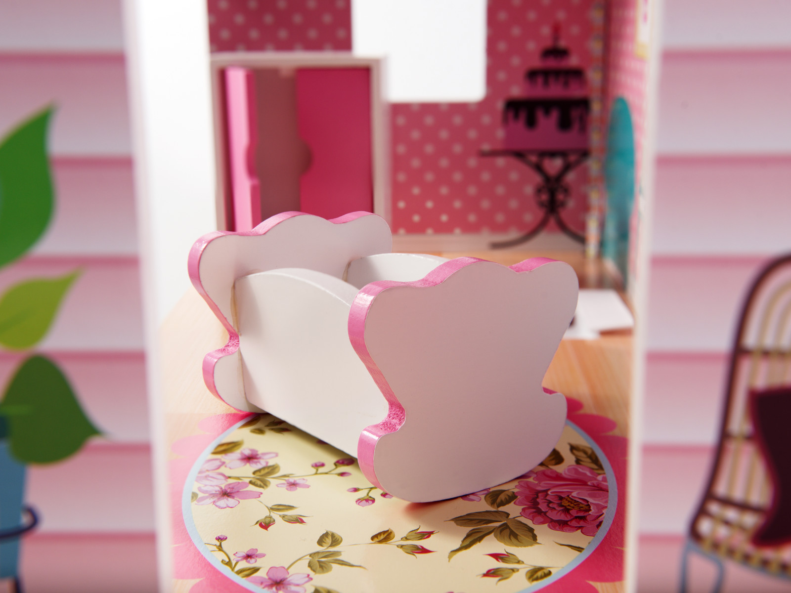 Το ξύλινο κουκλόσπιτο αποτελείται από τρεις ορόφους με πέντε δωμάτια : κουζίνα, μπάνιο, υπνοδωμάτιο, σαλόνι και διάδρομο. Το σετ περιλαμβάνει μια λωρίδα LED που τροφοδοτείται από μπαταρίες ΑΑ για να τοποθετηθεί στο σπίτι. Πολύχρωμα γραφικά στους τοίχους και ξύλινα έπιπλα θα ενθουσιάσουν τα παιδιά να παίξουν με αυτό το παιχνίδι!